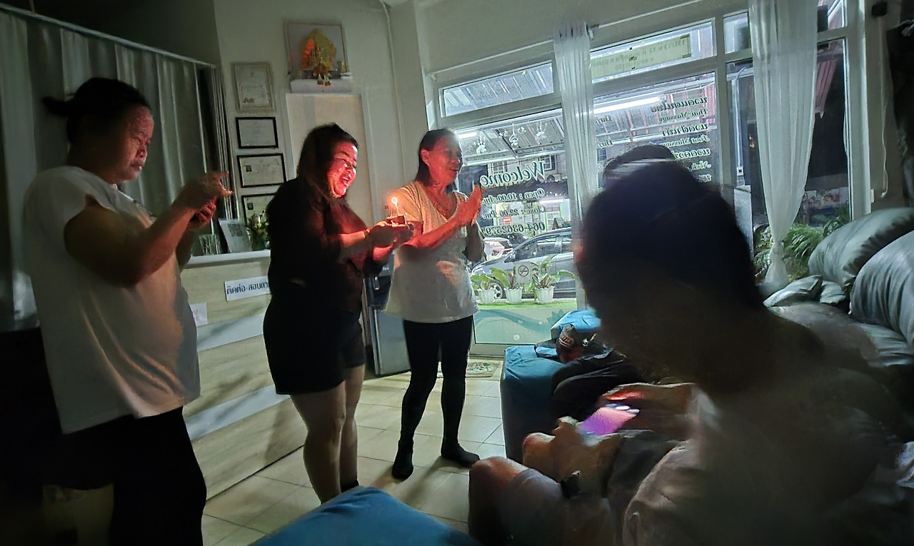 오늘이 총 생일이라는 얘기를 들은 마사지샵 아주머니들이, 어느새 작은 초코 조각케이크에 초를 켜고 생일 축하를 해 준다. 참 친절하고 고마운 태국 사람들이다. 총의 강권대로, 내 생각에는 과하다 싶게 50밧씩 팁을 드렸다. 저녁은 샵 근처의 현지 식당에서 평소처럼 먹었다.