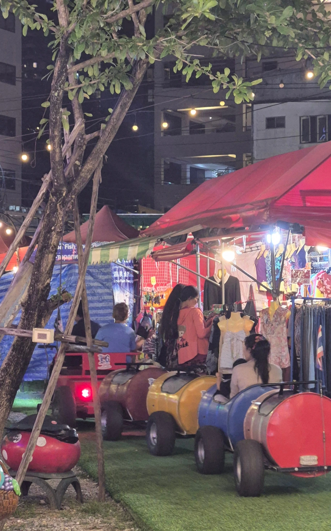 오후에 운동과 수영, 샤워를 마친 후, 총은 근처 식당에서 식사 후 일을 하고, 용관과 나는 좀티엔 야시장에 가 보기로 했다. 태국에서 여성들이 치마처럼 두르거나 비치웨어·랩스커트처럼 사용하는 얇은 천인 '사롱'을, 용관이 사고 싶어 했다.