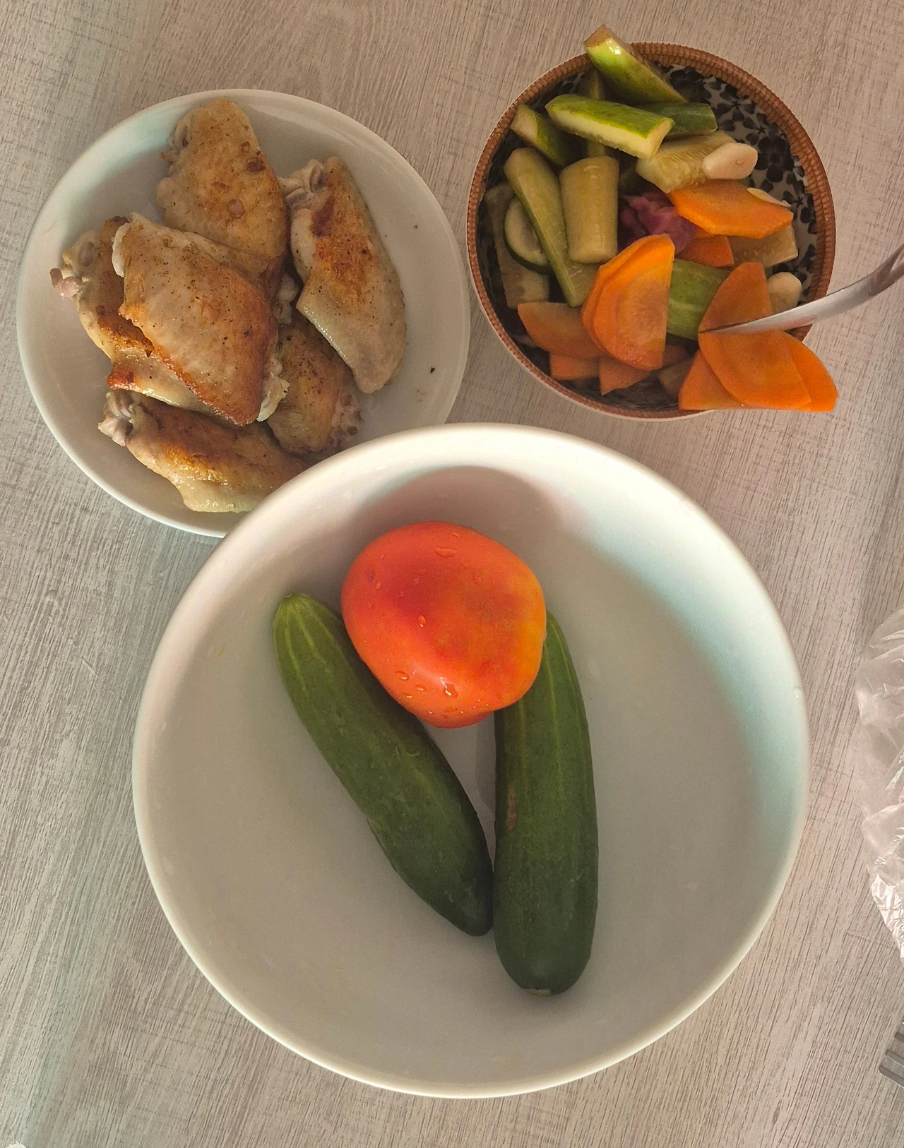 점심은 소금과 후추로 간한 닭날개를 구웠다. 영계를 주로 먹는 우리나라와는 달리, 닭날개가 굉장히 커 한 입에 먹기 버거울 정도다. 여기서도 역시 용관의 피클이 위력을 발휘한다.