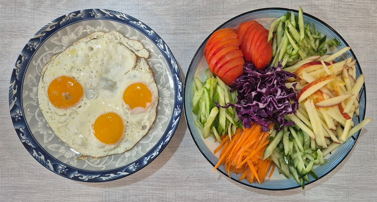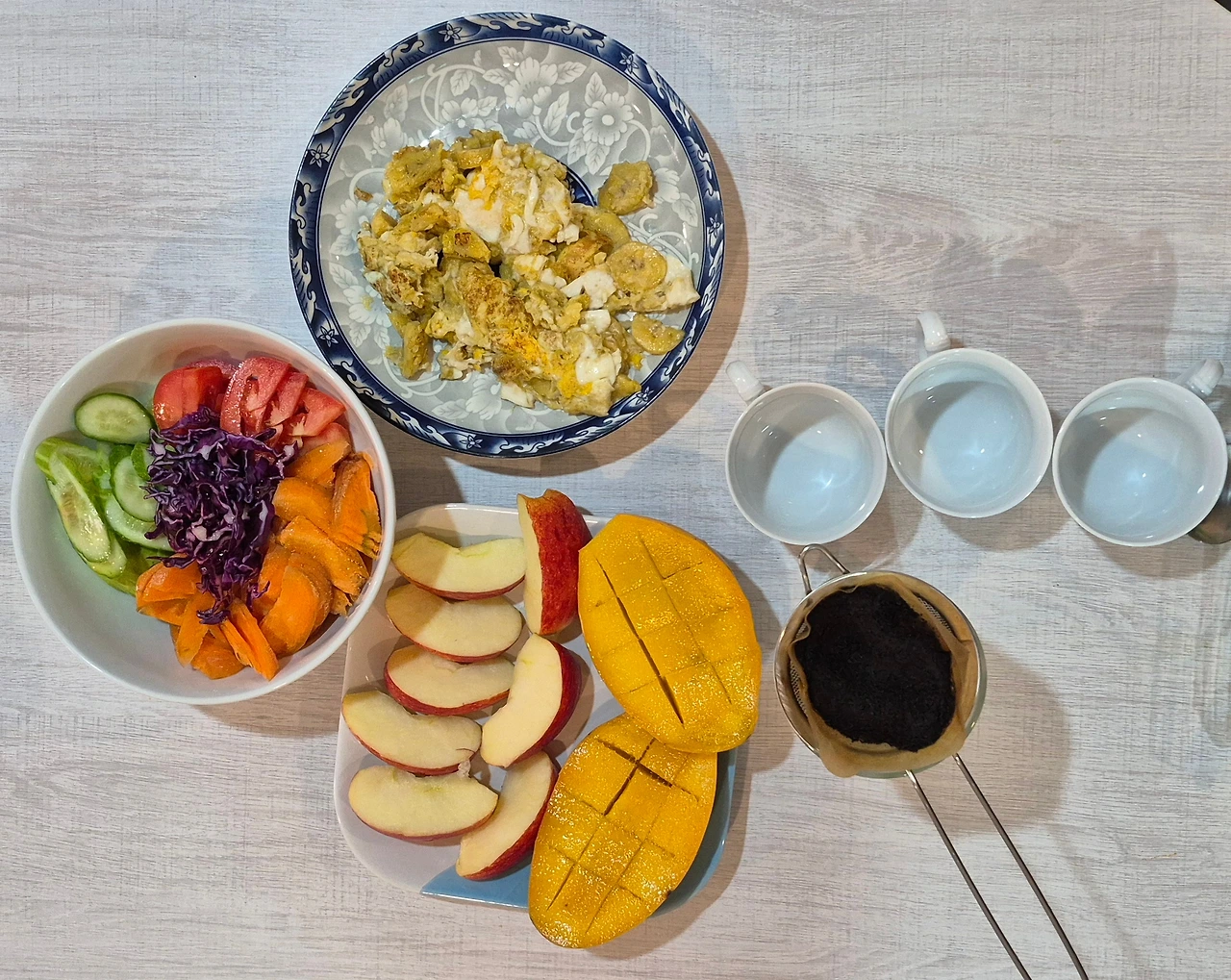 점심은 비빔면을 준비했다. 마크로에서 쩐내 나는 한국산 삼양 사리면을 괜히 15개나 샀다가 해치우느라 고생이다. 여러 번 물로 헹궈 쩐 맛을 제거하고, 오이, 당근, 토마토, 사과를 듬뿍 넣고 계란 프라이를 얹어 그럴듯하게 먹었다. 용관 말로는 '쇠자'같다는 식칼로 채를 써느라 애먹었다.