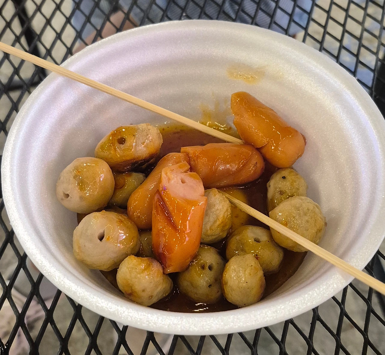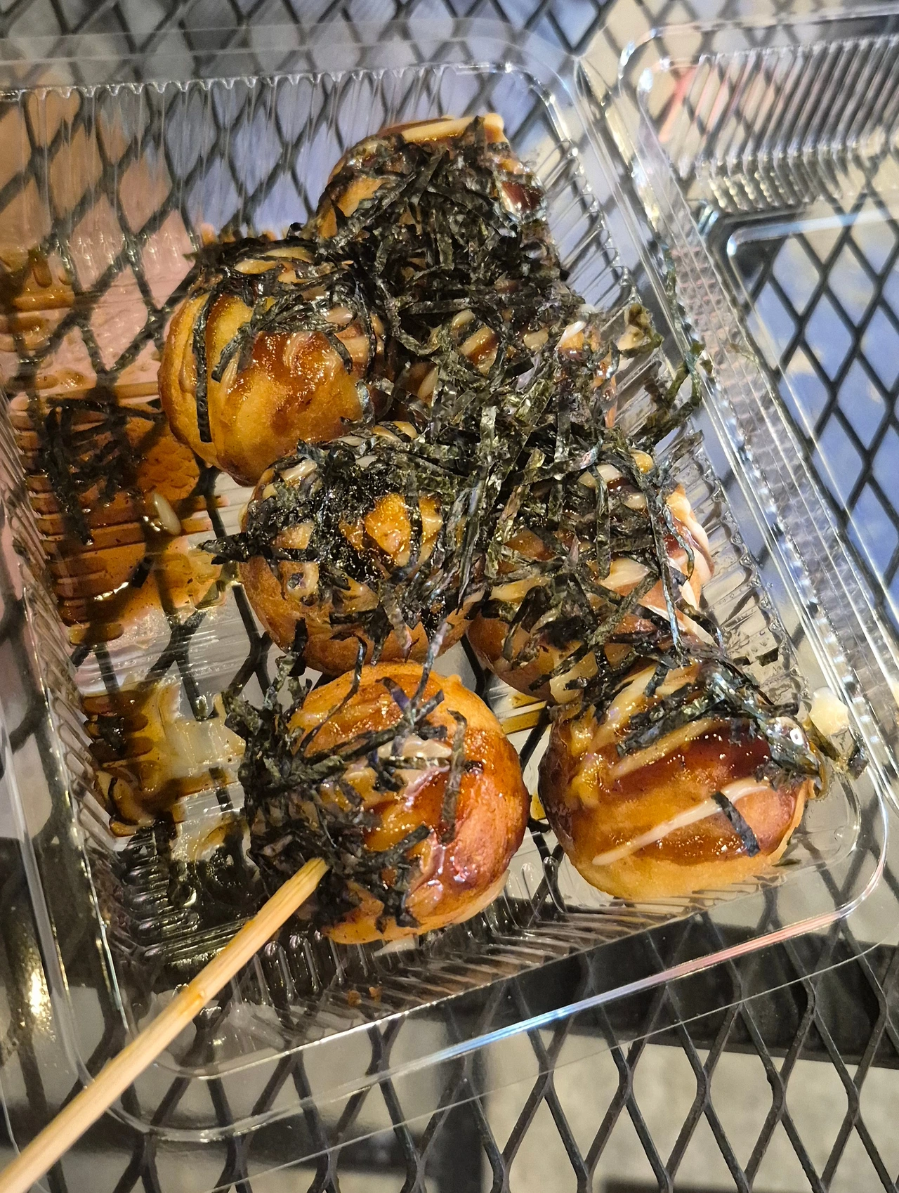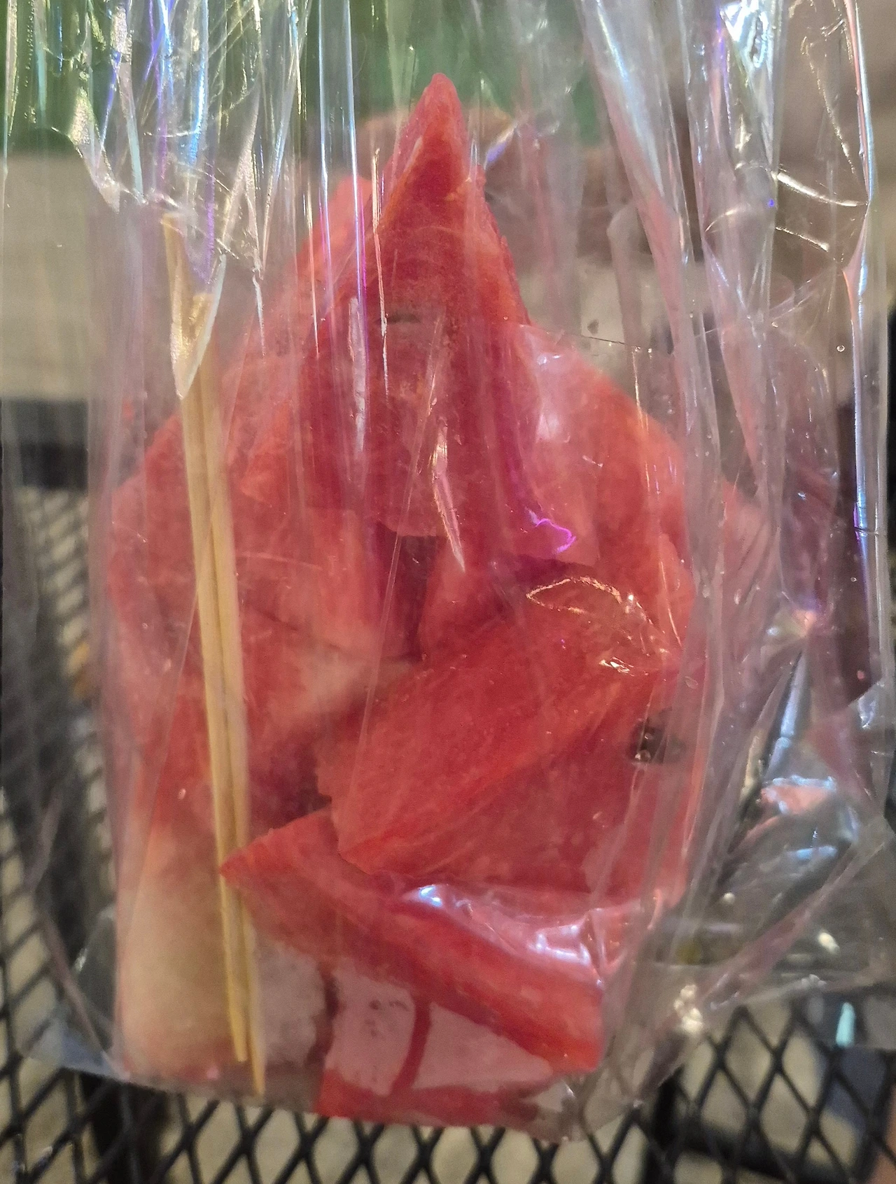 '사롱'을 파는 곳은 없었다. 10밧짜리 미트볼 꼬치구이 4개, 5가지 맛 타코야끼 2개씩 총 10개 60밧, 수박 30밧을 사 먹었다. 케밥, 스테이크는 다음번에 먹어보자 했다.