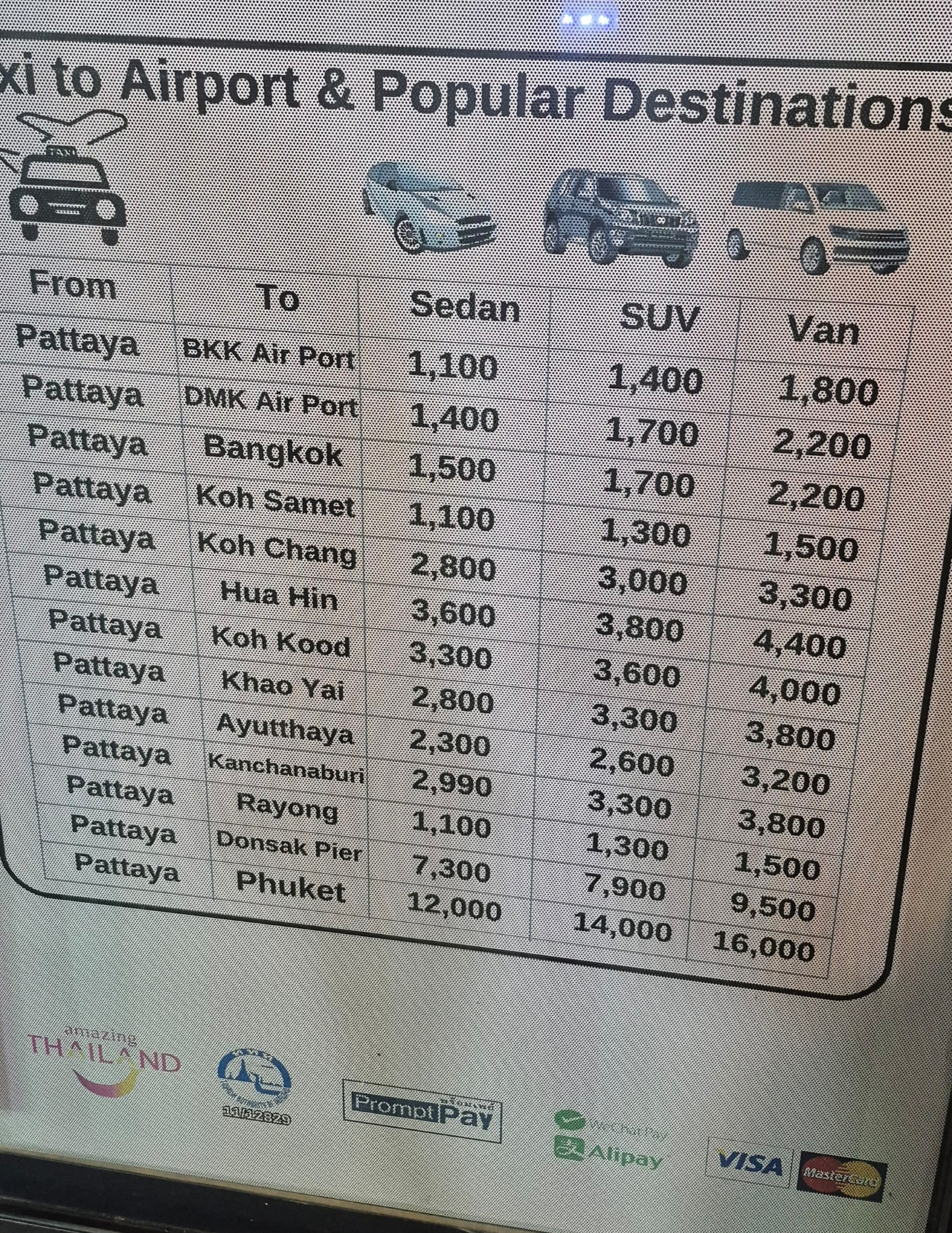 좀티엔 야시장 입구에서, 수완나품 공항까지 그랩보다 싸게 갈 수 있다는 요금표가 붙어있는 여행사를 봤다. 낮시간에 가봐야겠다.