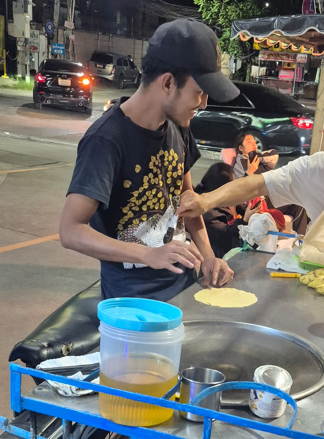 오늘은 용관이 저녁에 줌으로 책모임이 있었다. 용관은 운동을 건너뛰었다. 운동 후 재나 팟타이에 갔다. 손님이 없다고 일찍 닫았다. 총이 문을 두드렸더니, 실외 테이블에서 주문을 받았다. 돌아오며, 로띠 장인의 바나나계란로띠를 50밧에 먹었다.