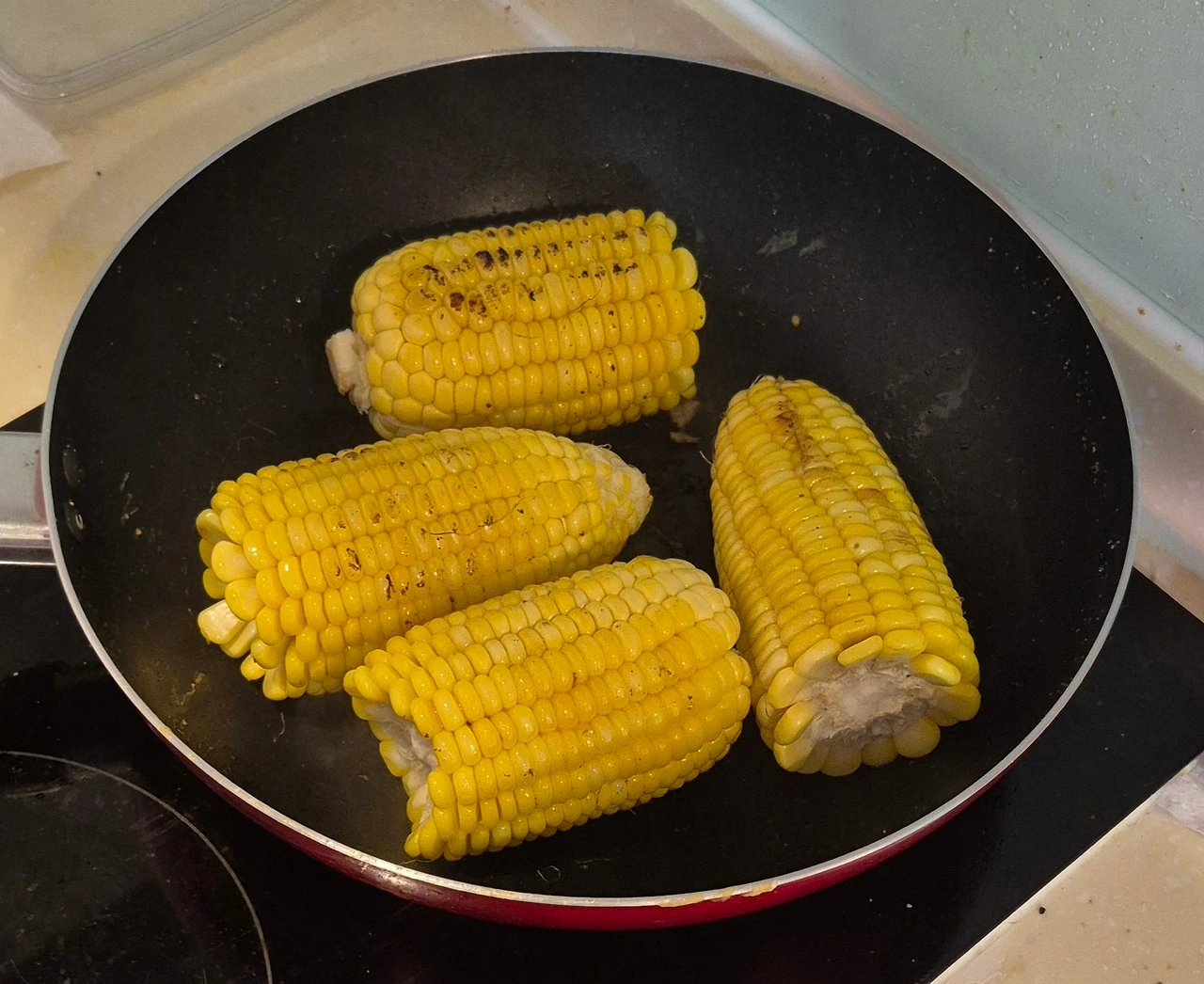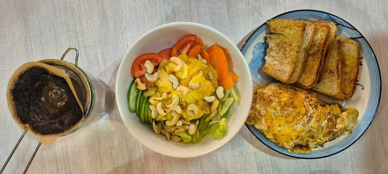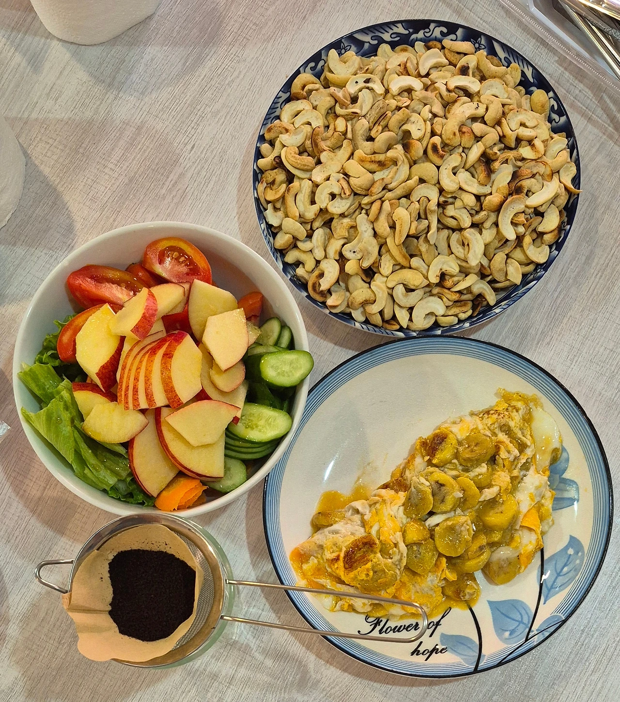 용관이 만드는 바나나 계란 볶음이 로띠처럼 맛있다. 간식처럼 먹는 생캐슈너트는 소금을 넣어 볶아 두었다. 옥수수도 버터구이를 했다.