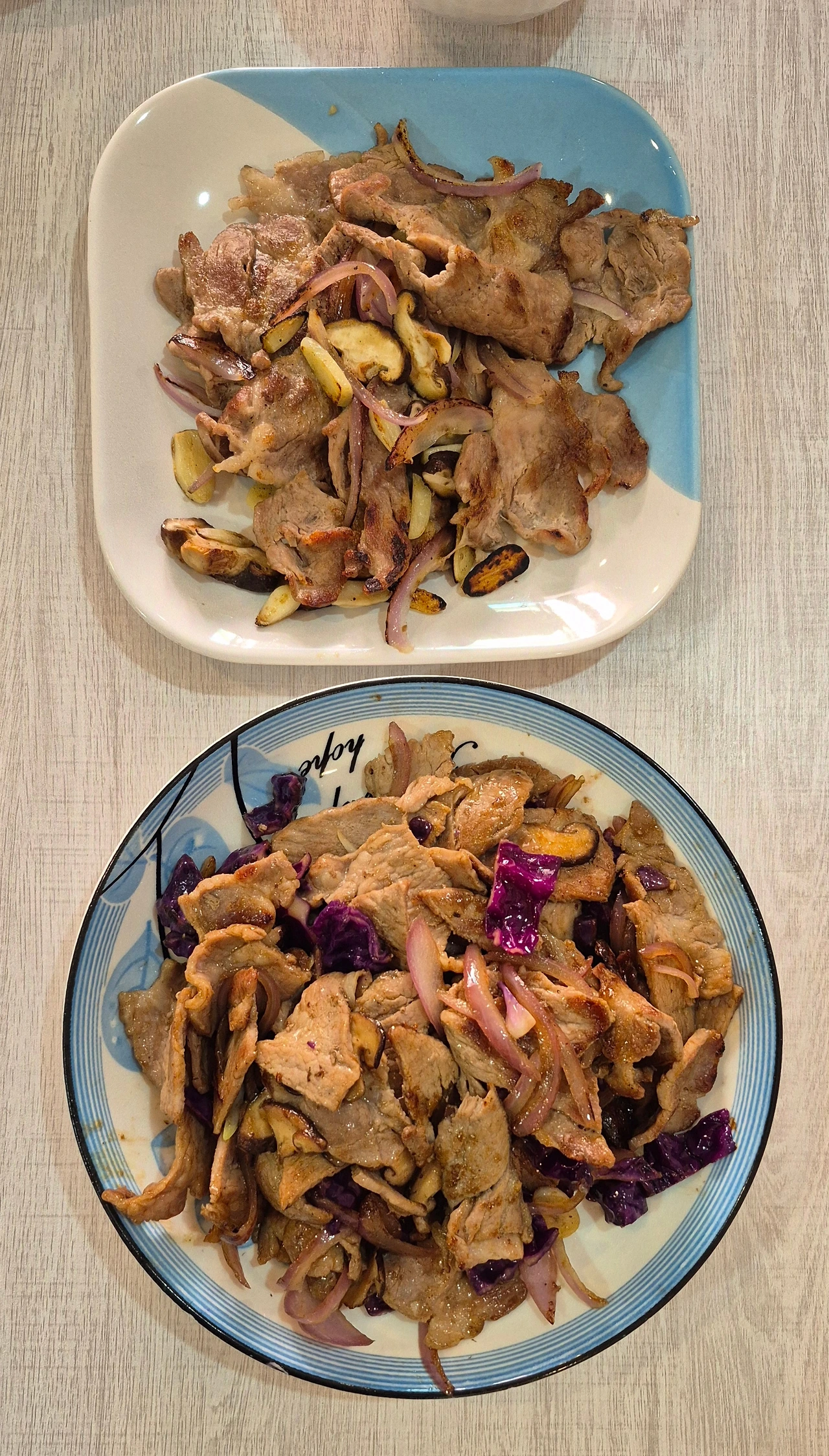 냉장실의 돼지 목살을 빨리 해치워야 해서 일부는 구운 후 채소와 볶고, 나머지는 굴소스와 숙주 등을 넣어 볶았다. 통밀빵 사이에 넣어 샌드위치로 먹었다.