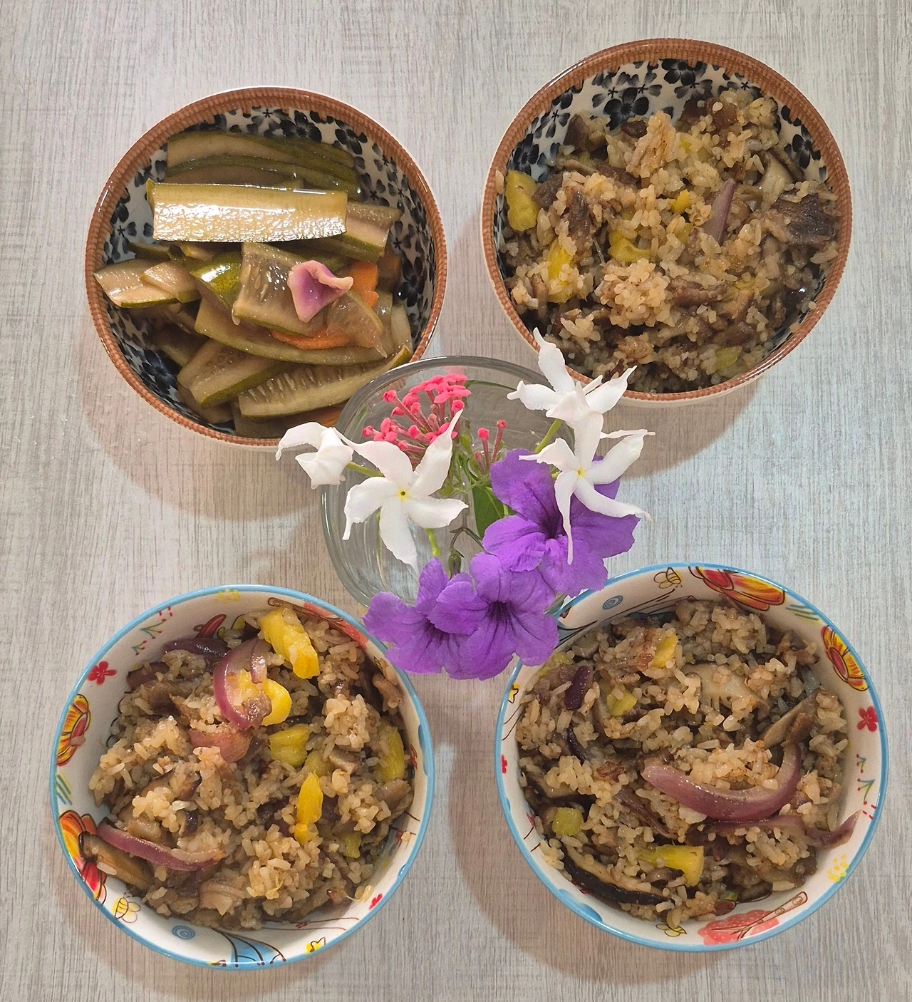 저번에 구워 놓은 돼지 목살에 양파와 버섯, 굴소스와 찬밥으로 볶음밥을 만들었다. 해동이 덜 되어 냄새가 심했다.