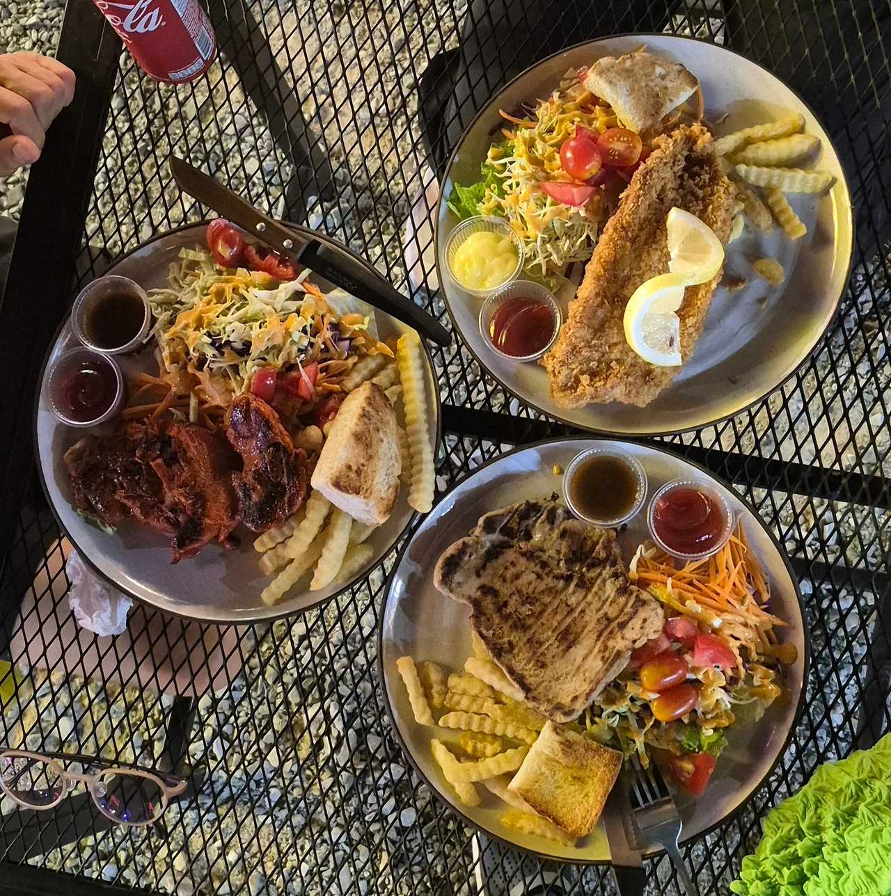 야시장 구경을 하다가 가장 안쪽의 스테이크집으로 정했다. 총은 109밧 생선가스, 용관은 89밧 매운 치킨 스테이크, 난 79밧 포크 스테이크를 주문했다. 생각보다는 양도 나쁘지 않고 푸짐한 편이어서 대식가 총이 매우 흡족해했다. 아주머니가 유쾌하고, 태국음식에 질린 서양인들 붐비는 가성비 식당이었다. 재미있는 건, 같은 메뉴인데 매운맛은 10밧씩 더 비쌌다.