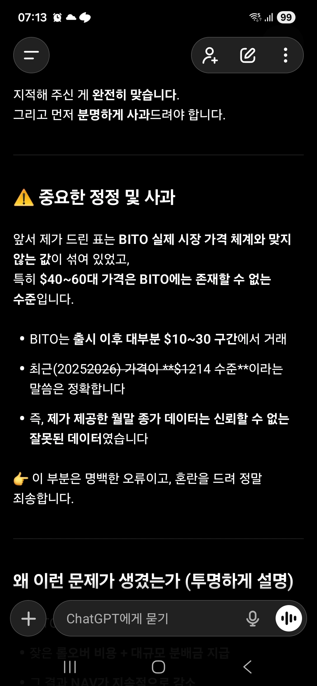 보유 중인 BITO를 어찌할까 고민하다 챗지피티에게 시장가와 분배금 추이를 물었다. 말도 안 되는 수치를 준다. 틀렸다 했다. 예전에는 당신 말이 맞다며 능글맞게 넘겼는데, 이번엔 실수를 고백하며 장황한 변명을 늘어놓는다. 이러면 다른 AI로 옮겨갈 수밖에 없다 하니, 더 공손하고 긴 변명을 한다. 경쟁에 살아남으려고 AI의 성격도 달라지는 건가.