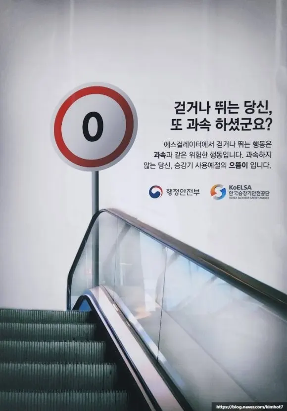 언젠 에스컬레이터 왼편을 비우라더니, 이젠 걷는 건 무례하다 지겹게 광고한다. 준엄히 꾸짖기 전에 적어도 예전 캠페인은 실수였다고 사과라도 하는 게 예의 아닌가.
