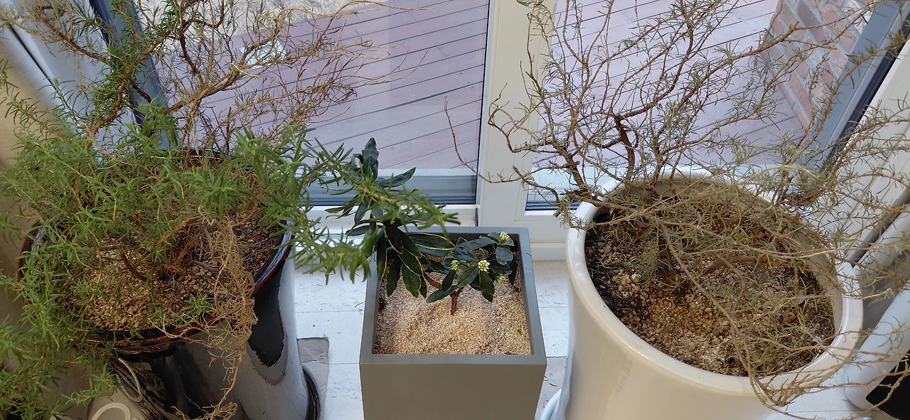 백리향에 꽃망울이 맺힌 지 오랜데, 아직 꽃이 안 핀다. 원래 이런가? 몇 년째 잘 버티던 로즈마리 하나의 상태가 좋지 않다.
