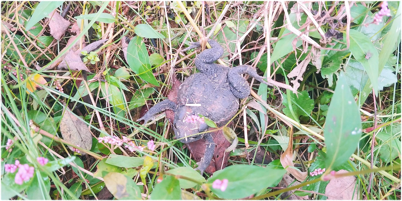 양서류로는, 두꺼비가 있다. 이 녀석은 단 한 번밖에 보지 못했다. 주차장 경계에 큰 플라스틱 화분을 두었는데, 그중 하나의 화분 아래 빈 공간에 있었다. 바둥대던 녀석을 쓰레받기에 잘 얹어 산으로 보내주었다. 도대체 왜, 어떻게 거기에 있게 되었는지 지금도 모르겠다. 구멍 난 항아리를 막아 콩쥐를 도와주었다는 두꺼비의 이야기가 왠지 이해가 되는 기분이다. 파충류가 나타나지 않는 걸 다행이라고 해야 할지.