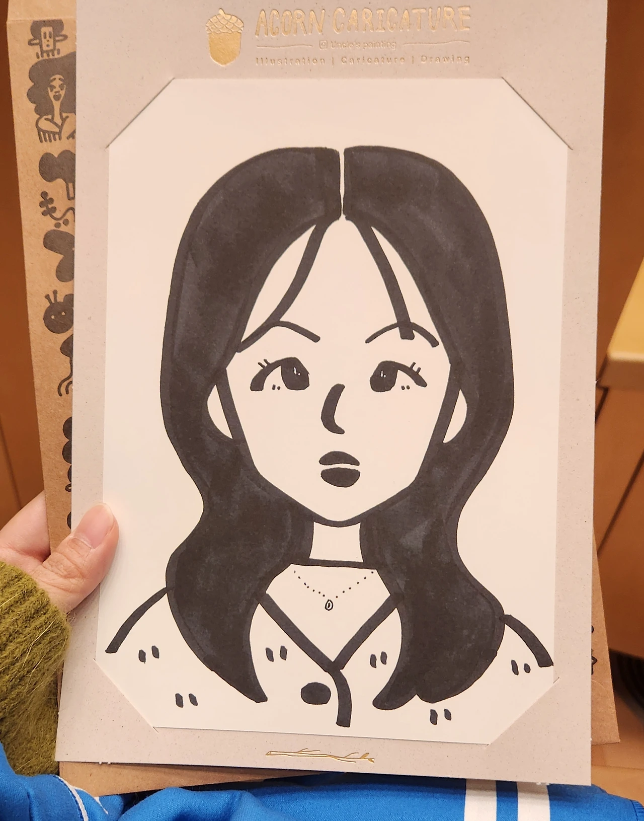 이미 하루 전에 다녀온 동기들의 꿀팁을 들었기 때문에, 점심밥보다 중요한 게 있다는 것을 알았다. 그것은 바로 캐리커쳐 부스에 캐치테이블처럼 순서를 걸어두는 것이었다. 듣기로는 나 혼자 산다 프로그램에서 이찬혁이 엄마와 연남동 데이트에서 갔었던 캐리커쳐 그려주는 샵이라고 한다. 가보니 이미 다른 동기들도 줄을 기다리고 있는 모습을 보고 '행사 기획자들이 MZ 마음 제대로 읽었네'라고 생각했다. 내 차례가 되어 들어가 보니 5분도 안되어 캐리커처를 쓱싹 그려주셨다. 보통 희화화를 하기 마련인데, 오히려 현실보다 오백배는 예쁘게 그려주셔서 너무 기분이 좋았다. (반쪽: 동의할 수 없다. 실물이 오백배 더 예쁘다.) 한껏 신나 SNS에 올리자 DM으로 요즘 여기 사람이 너무 많아서 못 가봤다는 얘기도 들었다. 뭔가 모를 뿌듯함도 느끼고 이걸 회사에서 누리다니 파란피가 약간 차오르는 것 같았다.