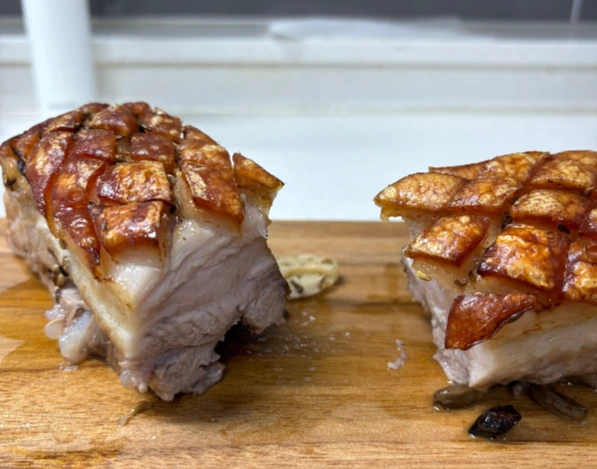 그렇게 한참을 기다렸고 대망의 오븐을 열었다. 비주얼은 대성공이었다. 고든램지가 계속 중얼거리던 대로 Nice and Crispy 하게 오겹살의 껍질 부분이 제대로 튀겨진 모양새였다. 2시간 동안 오븐에서 고생한 오겹살을 꺼내준 다음 반으로 갈라보았다. 와아- 껍질이 Crispy 하다 못해 터프하게 딱딱해서 처음에 칼로 썰기 어려웠지만, 두툼한 오겹살이 완벽하게 푹 익었다.