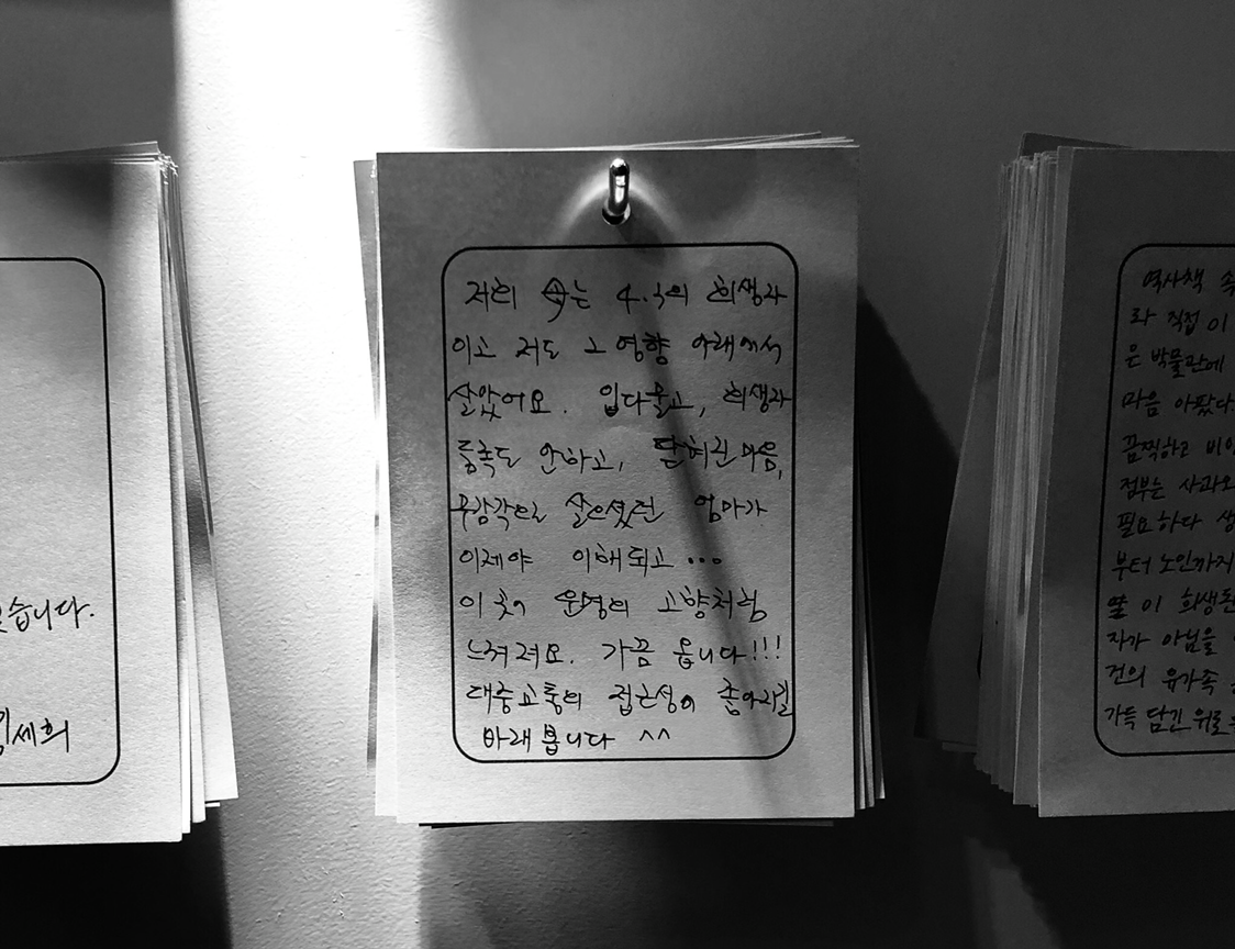 일부러 계획하지는 않았는데 4월 3일이 있는 주에 제주여행을 왔다. 눈을 들면 화사한 벚꽃이 만발해 있고 거리 곳곳에는 꽃 채로 떨어진 동백꽃이 흩뿌려져 있었다. 70주년 기념 추도식 뒤의 여파가 남아 있는 제주 4.3 평화기념관은 단체관람을 온 학생들로 가득했다.