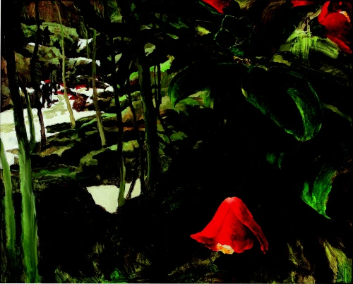 강요백 화백의 4.3 연작시리즈 <동백꽃 지다>. 붉은 동백이 통 꽃으로 떨어지는 장면 뒤 좌측 상단부에는 토벌대의 모습과 하얀 눈 밭에 뿌려진 피가 보인다. 강화백은 동백을 4.3 당시의 제주민으로 표현했고 이후 겨울에 피는 동백꽃은 4.3의 상징꽃이 되었다. 그림 이미지 출처: 프레시안 https://goo.gl/xQBkkT