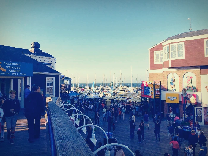 이제 날이 어두워지고 있어서 저녁식사도 할 겸 Fisherman's Wharf에 들렀다. 피셔맨즈 워프는 에어비앤비 호스트인 Marla 아줌마가 절대로 가지 말라고 한 곳이다. 식당에 사람이 너무 많고 비싸고 맛이 없다는 이유에서다. 그런데 호주 친구들은 딱히 갈 데도 없다며 그냥 가서 먹자고 했다. 역시 사람은 많았고 음식은 비쌌다. 맛은 그럭저럭 먹을 만했다. 음식 맛보다는 넓은 창으로 보이는 일몰이 장관이었다.