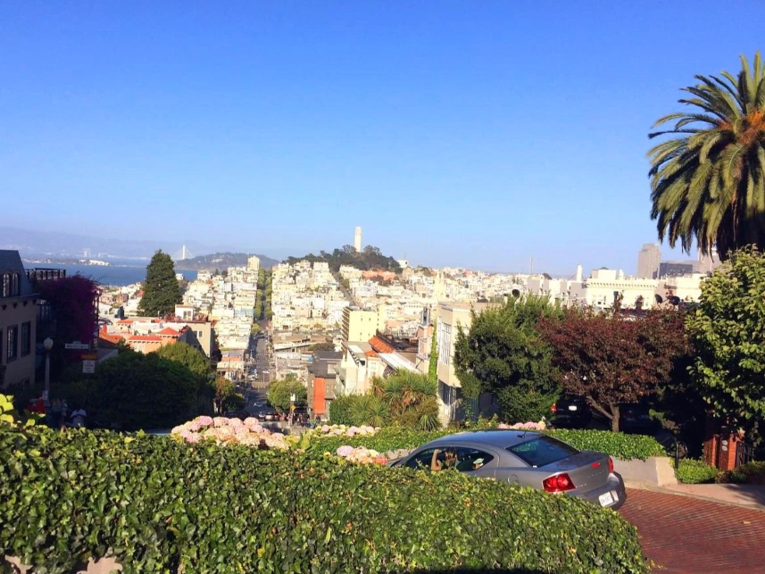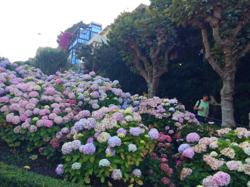 점심을 먹고 향한 곳은 롬바드 꽃길 (Lombard Street). 세계에서 가장 구불구불한 길 (the most crooked street in the world)로 불리는 이곳은 27도나 되는 급경사의 위험성을 줄이기 위해서 8번 구부러지게 길을 설계했다고 한다. 탐스러운 꽃들로 가득한 이 길의 총길이는 180m 정도이고 제한속도는 8km/h이다. 차로만 다닐 수 있는 이 길을 구경하기 위해 자동차들이 끝도 없이 내려온다.