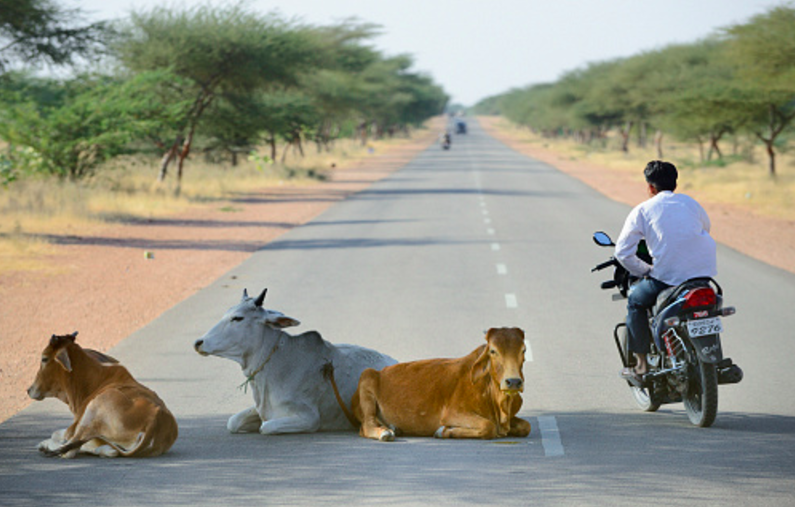인도에서는 소가 신성시된다. 위 사진처럼 길에 앉아 있어도 누가 뭐라 하지 않고 방해하지도 않는다. 소가 비켜줄 때까지 기다리던가 소의 휴식(?)에 방해되지 않게 돌아서 간다. 이렇게 된 이유로는 힌두교의 신이 타고 다니는 동물이라서 라는 설도 있고, 예로부터 농사에 사용되어졌으므로 소가 없으면 생활하기가 어려워서 귀하게 대접한다는 얘기도 있다. 아무튼 인도에서는 소 팔자가 상팔자이다.