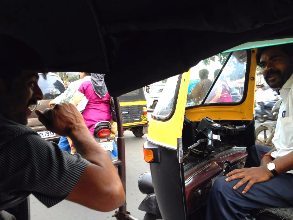 먼 거리의 이동은 오토릭샤를 이용했다. 오토릭샤는 오토바이를 개조해서 만든 교통수단인데 앞에 바퀴 하나 뒤에 바퀴가 두 개 있다. 앞에는 오토바이 모양의 운전대가 있고 뒤에 손님이 앉을 수 있는데 두 명이 타면 꽉 끼는 사이즈이다. 타기 전에 일단 가는 곳을 얘기하고 가격을 흥정해야 한다. 운전수에 따라 가격이 천차만별이다. 흥정이 잘 되지 않을 때는 목소리가 높아지기도 하고 (싸우는 건 절대 아니다), 어쩔 때는 주위의 릭샤 운전수들이 와서 구경을 하기도 한다. 처음에는 같은 패거리들이 몰려와서 손님을 위협하는 건가 싶었는데 이 사람들 말 그대로 그냥 재미로 구경하는 거였다. 인도 사람들은 호기심이 많다.