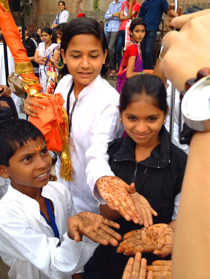 얘기하고 있는데 앞에 있던 꼬마 남자애의 손에 뭔가 그림이 그려져 있는 게 보였다. 손바닥 좀 보여달라 해서 봤더니 공연을 위해서 헤나 같은 걸 그려 놓은 것이었다. 옆에 있던 아이들이 자기들 손에도 그림이 있다며 모여들어서 보여준다.