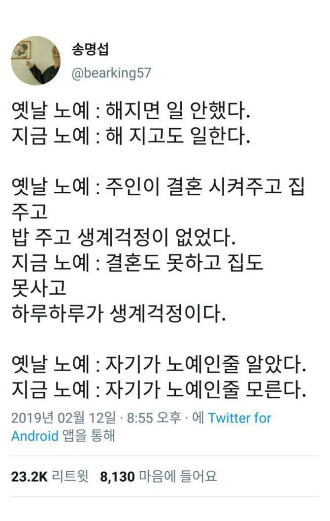 실제로 저 개인은 브런치 외에 다른 곳에 글을 쓰는 일이 극히 드물기 때문에 나름대로 남에게 피해를 주지 않으며 합리적으로 자유를 누리고 있다고 생각하고 있습니다. 그런데 문득 그저께 일이 생각나네요. 전날 술을 많이 먹어 극도로 하기 싫은 출근길을 가까스로 사수하던 아침이 말입니다. 게다가 전날 술 역시 원해서 마신 것이 아닌, 회사의 강요 아닌 강요 속에서 이루어졌음에도 불구하고 다음날 출근을 하지 않는 것을 선택할 수는 없습니다. 일주일 동안 꽤 많은 시간을 노동하여야 비로소 주말의 자유를 얻을 수 있으며, 그나마도 가끔은 그 자유마저 빼앗깁니다. 업무가 많을 때 저의 노동 시간과 강도를 생각하면, 모르긴 몰라도 조선시대 노비도 혀를 내두르지 않을까 하는 마음까지 듭니다. 얼마든지 자유로운 사회에서 왜 저는 이렇게 자유롭지 못하는 걸까요? 답은 뻔합니다.