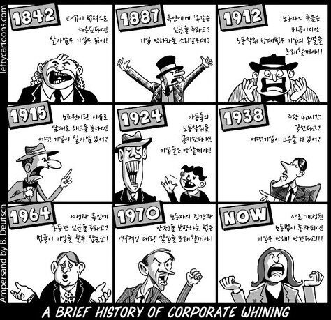 초기 자본주의에 영국은 어린이들까지도 장시간 노동에 시달렸다는 것은 교과서에서도 본 기억이 있습니다. 기업가는 계속해서 더 많은 이윤을 얻기 위해 직원들을 착취하며, 이를 해결할 방법은 몽쳐서 저항하는 것뿐이다라는 마르크스의 사상이 각광을 받았던 것도 이런 경험 때문일 것입니다. 흩어진 상태의 노동자가 뭉치면 사실 어떤 자본가도 버틸 수가 없습니다. 이는 과거 왕정 시대와 같습니다. 노예나 노동자의 비율이 언제나 압도적으로 높기 때문에 그들이 들고일어날 경우 귀족이나 자본가는 답이 없습니다. 하지만 이런 일은 거의 벌어지지 않습니다. 다양한 스펙트럼을 가진 사람들이 뭉치는 것은 생각보다 어렵기 때문입니다.