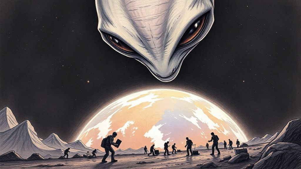 두 번째 그림 : Red panda AI, Prompt : Draw a picture of a giant alien looking at Earth. People on Earth should be shown working hard.