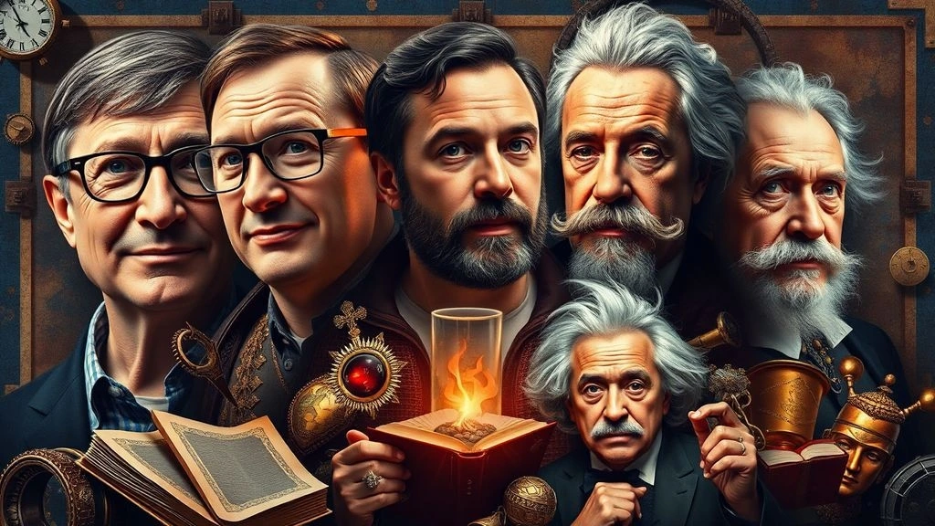 첫 번째 그림 : Red panda AI, Prompt : Make me a picture with the faces of Bill Gates, Elon Musk, Napoleon, Genghis Khan, Newton, Einstein and influencers.