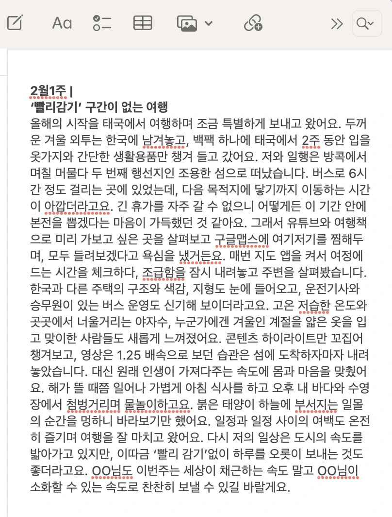 혹시나 최종 수정할 것이 있다면 금요일까지 수정사항을 남긴다. 다들 글꾼이라 이런 일은 자주 없다. 다음 주 월요일에 오렌지레터와 블로그에 올라간 글을 확인하면 된다.