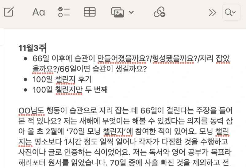 챌린지와 관련한 주제에 어떤 제목을 쓸까 고민하다가, 동료에게 글을 읽고 가장 어울리는 제목이 무엇인지 묻고 결정했다. 챌린지보다는 '습관'이 들어갔으면 좋겠다로 의견이 모여서, 그중에 '66일이면 습관이 생길까요?'를 최종으로 골랐다.