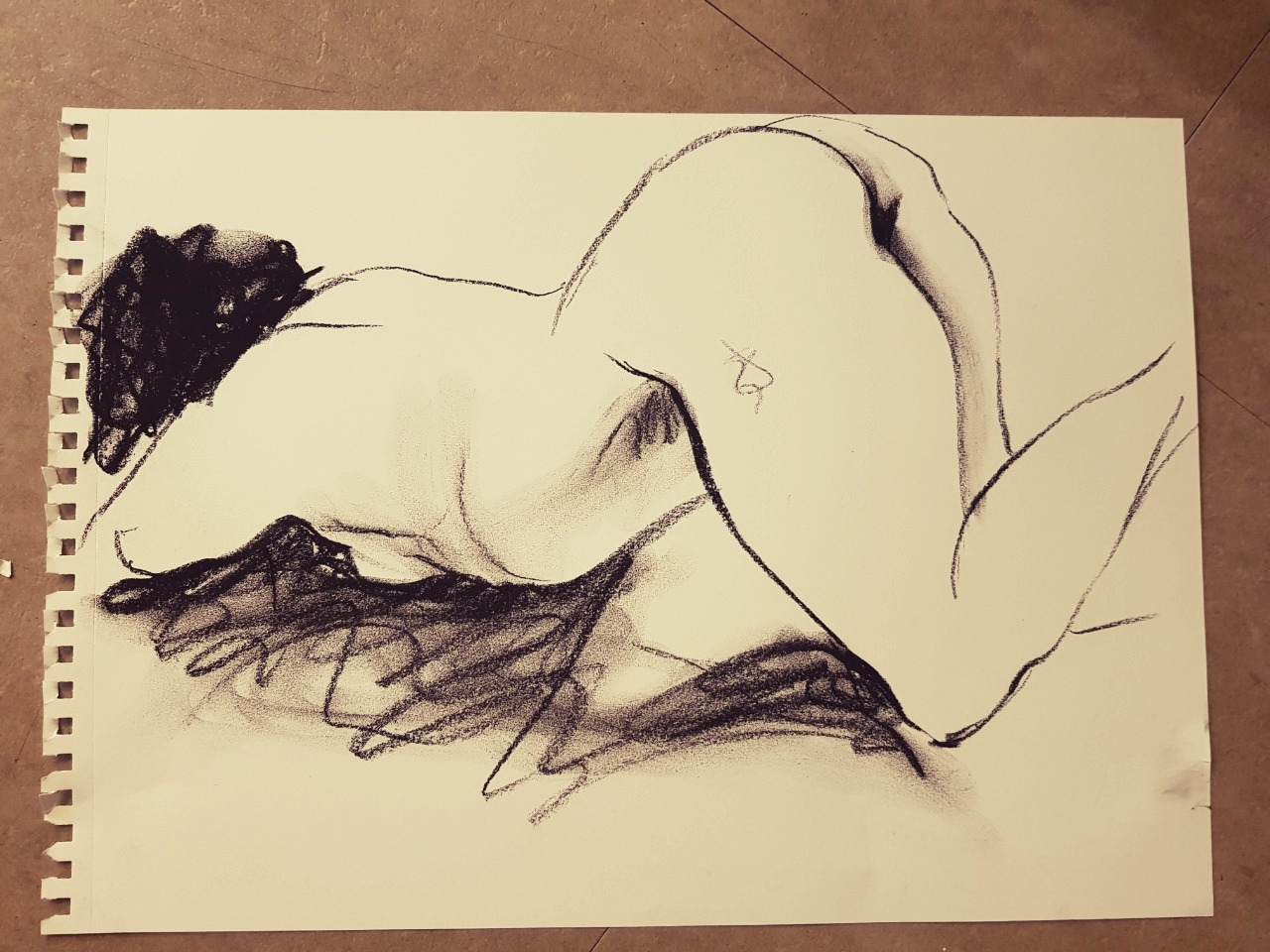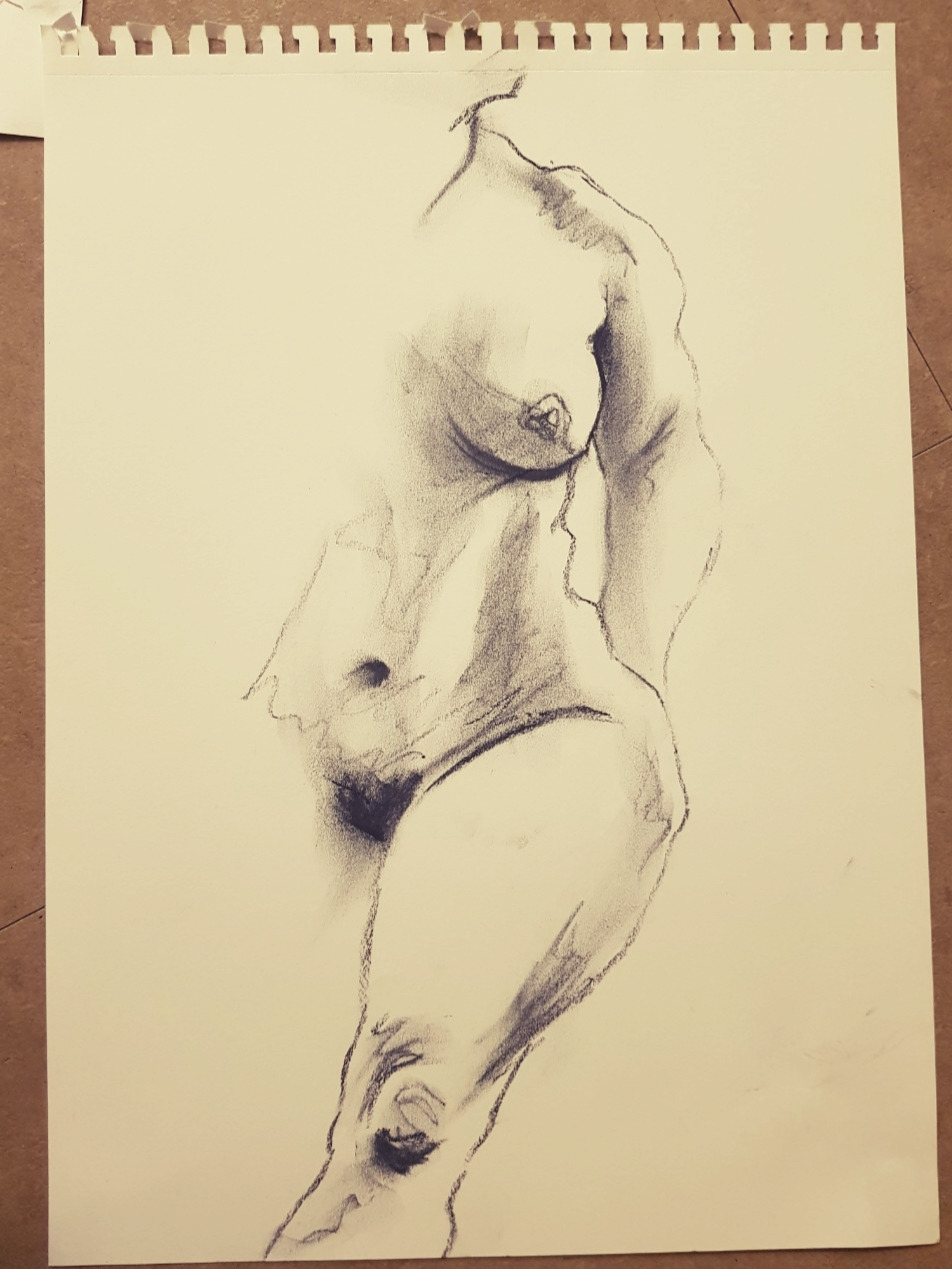 누드모델은 자세를 2.3 분만다 한번 씩 바꾸어가며 포즈를 취했는데 그 포즈를 시간안에 스케치북에 담기에는 내 손이 무능했고, 그리하여 정신없이 갈기다시피 선을 몇 개 그리다보면 끝이 났다. 한 시간쯤 하고 휴식시간을 10분 가지고 또 다시 한시간을 더 그렸는데, 모델이야 당연히 힘이 들겠지만 서툰 솜씨로 그려대는 나는 정말 힘이 들었다. 부족한 능력에 애를 바둥바둥 써대니 진이 빠졌다. 그렇게 내게 누드크로키는 결코 쉬운 분야가 아니었다.