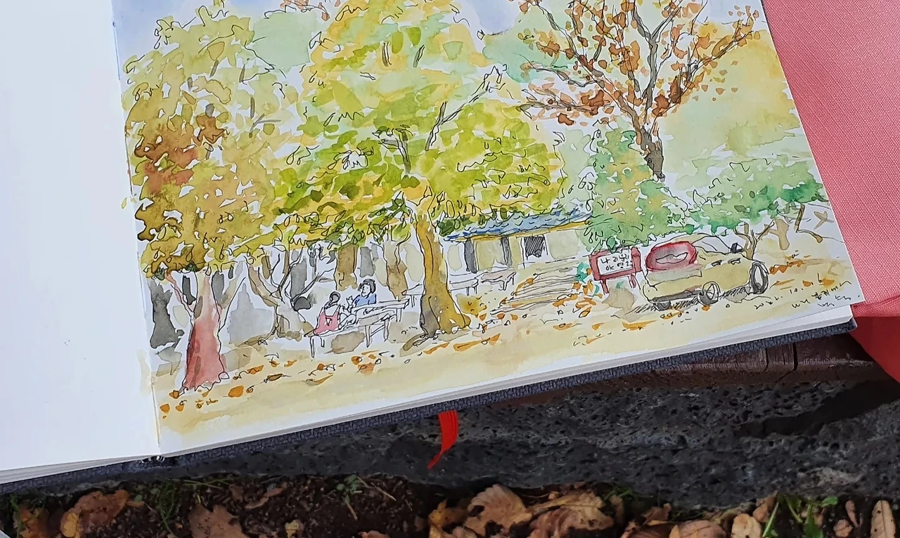 파랑, 하양, 노랑, 갈색, 빛바랜 초록색들이 가을 날을 그렇게 물들이고 있었고, 그 색깔들을 나는 작은 종이에 신나게 담아보았다. 그 식당에는 많은 사람들이 서로 얘기하며 즐거운 시간을 보내고 있었고, 나는 그 사람들을 보고 나만의 시간에 푹 빠져들었다.