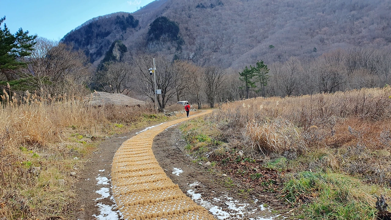 나리분지는 다행히 눈은 쌓이지 않았고 그래서 걷는데는 전혀 지장이 없었다. 나는 김장김치할 때나 입던 아주 두터운 겨울 초록색 오리털파카를 입고 동료선생님이 손수 짜준 초록색 목도리(hand made라고 택도 붙어있다.)를 목에 감고 그리고 귀도리(이것 역시 동료선생님이 손수 떠주신 것)를 머리에 쓰고 조심스럽게 발을 디뎠다. 쾅쾅 걷게 되면 다리에 무리가 갈까 조심스레 한발 한발 소리를 내지 않고 걸음을 옮기며 숲속 나무들을 감상하며 천천히 걸었다. 더 천천히 명상하듯 걷고싶었으나 동행한 분들이 불편해할까봐 그러진 못했다.
