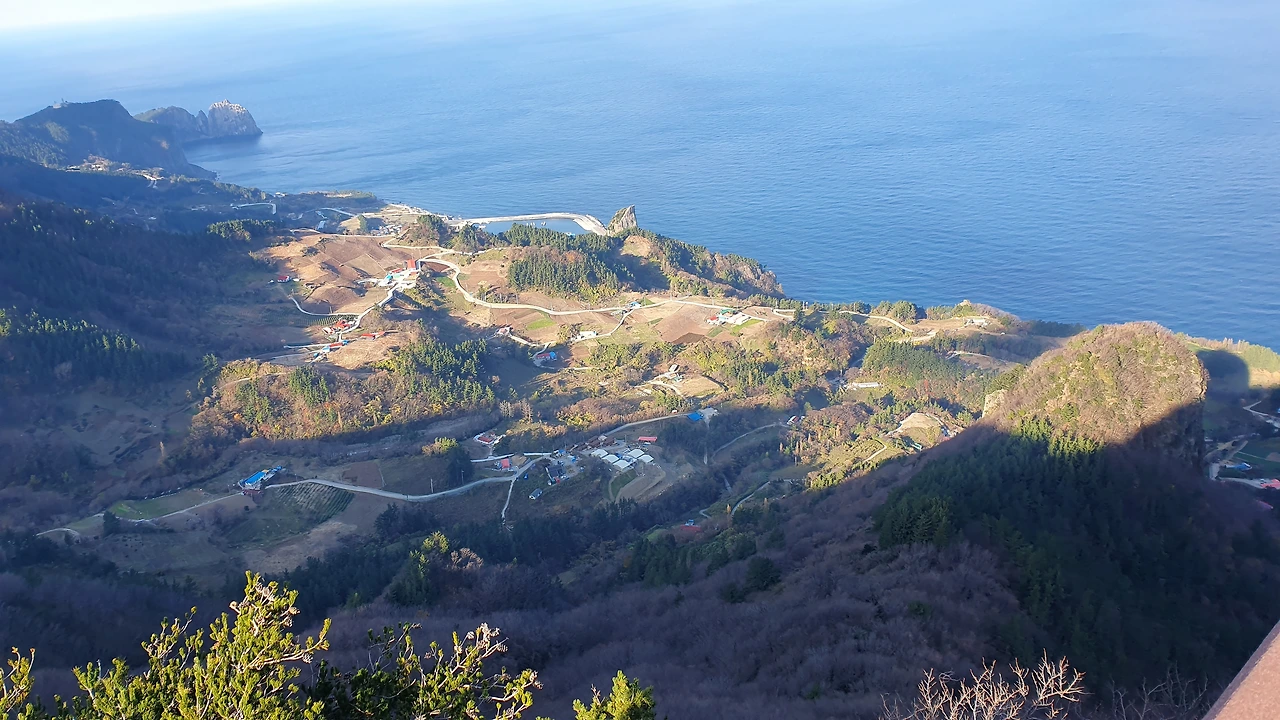그래서 이 깃대봉은 등산을 잘 못하는 누구라도 크게 걱정없이 올라갈 수 있을 것 같다. 산꼭대기에서 내려다 보는 풍경은 정말 아름다웠다. 울릉도는 어딜 가도 그렇지만 산꼭대기에서는 항상 바다가 보인다. 그리고 바닷가에 드문드문 있는 작은 집들과 그 집들과 집들을 이어주는 하얀 길들이 멀리 떨어진 집들을 이어주고 있다. 그리고 이 하얀 길은 어찌보면 겨울의 햇빛받아 빛나는 하얀 나뭇가지를 닮아있기도 하다.