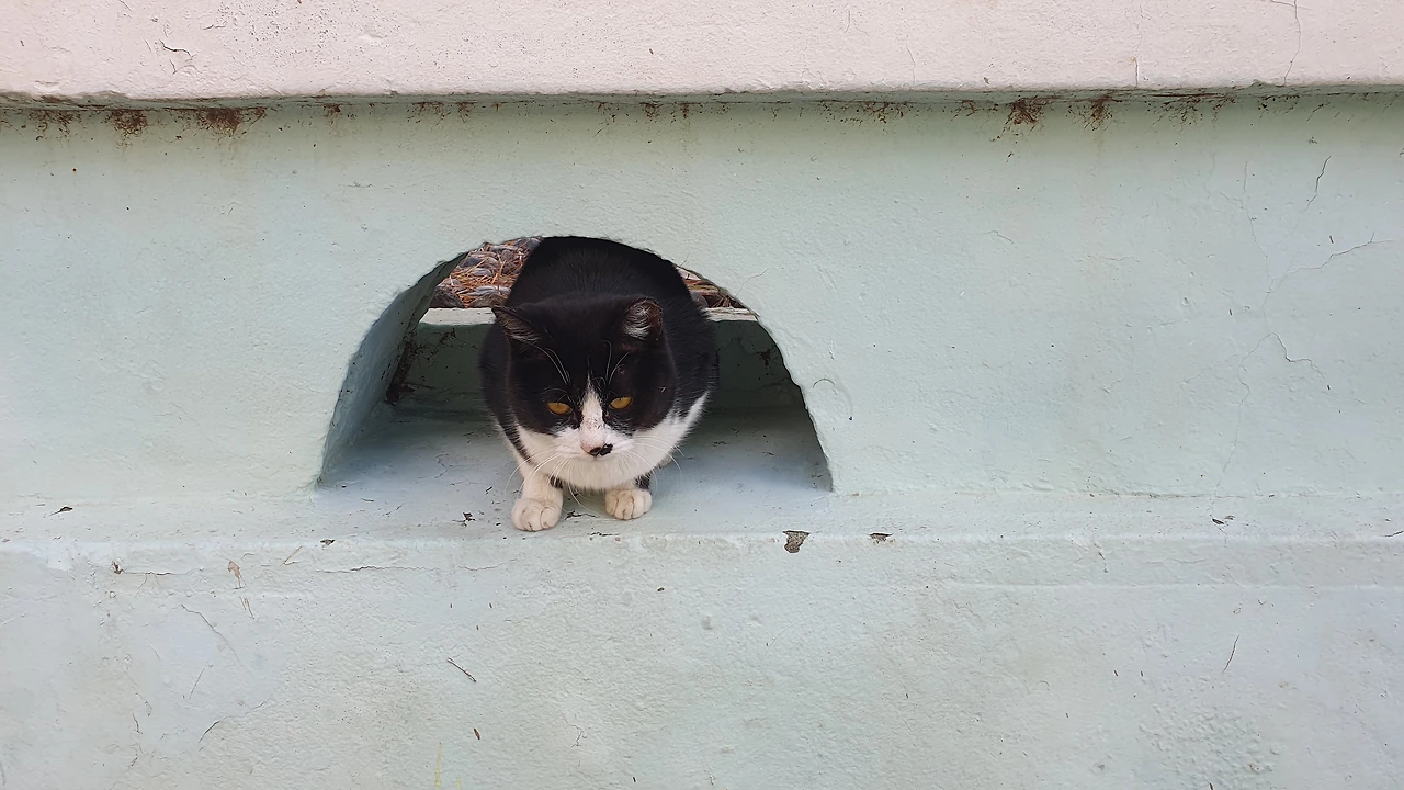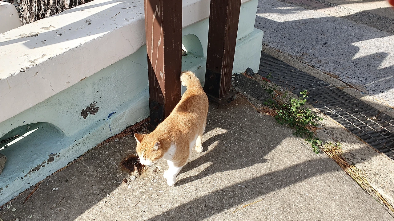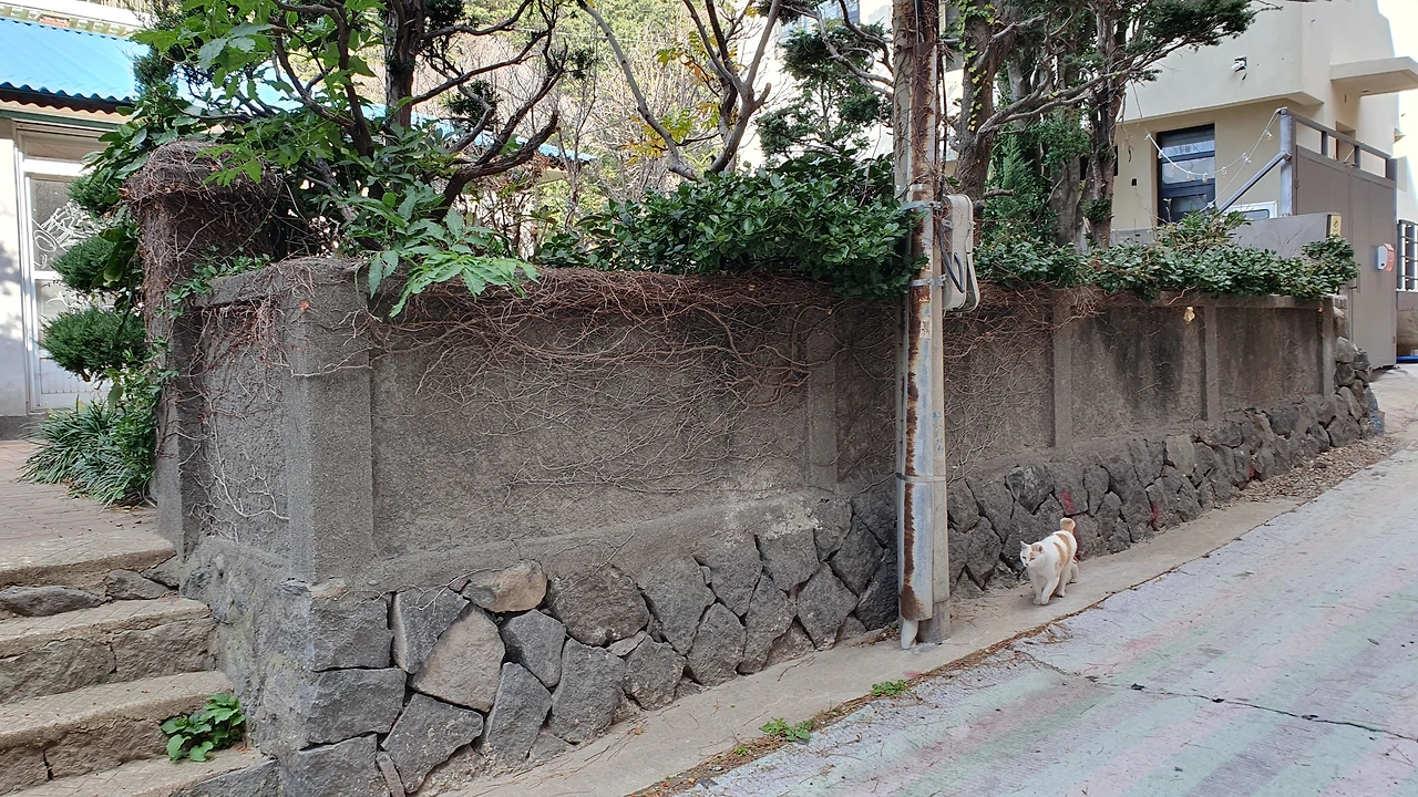 골목길 입구에는 관공서가 하나 있는데 관공서 계단에 하얗고 토실토실 살이 오른 고양이 한마리가 햇볕을 쬐며 웅크리고 앉아서 나의 가는 모습을 고개를 돌려가며 보더니 내 뒤를 살금 살금 따라온다. 몇 발짝 더 걸어가니 발벼락 구멍에서 희고 검은 무늬를 가진 고양이가 웅크리고 앉아서 나를 또 지키보고 있다. 조금 더 가니 토실토실한 흰 고양이 한 마리가 또 한마리가 골목길에서 어슬렁거리며 소리없이 나를 따라온다.
