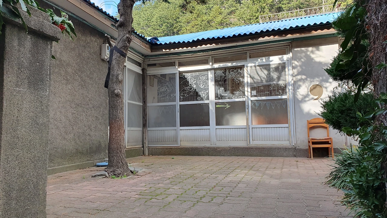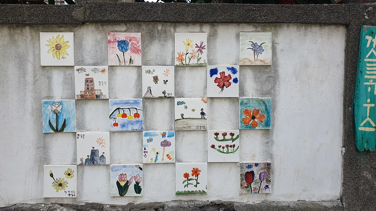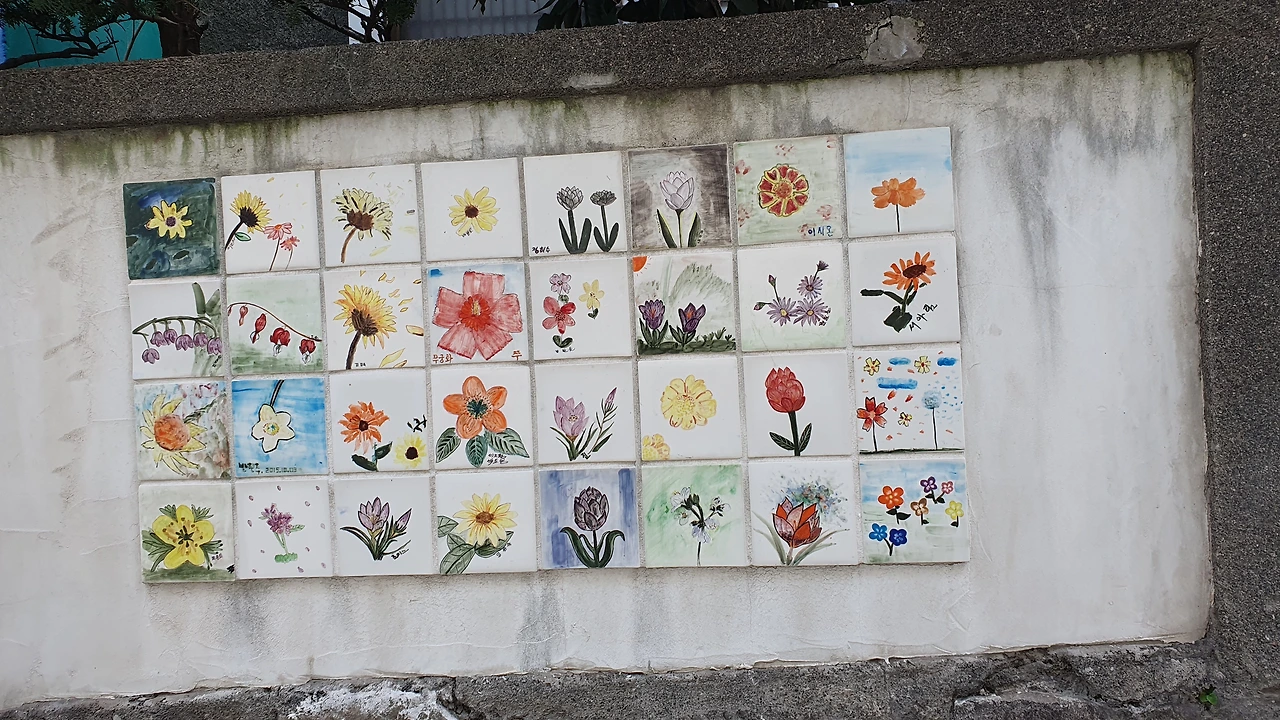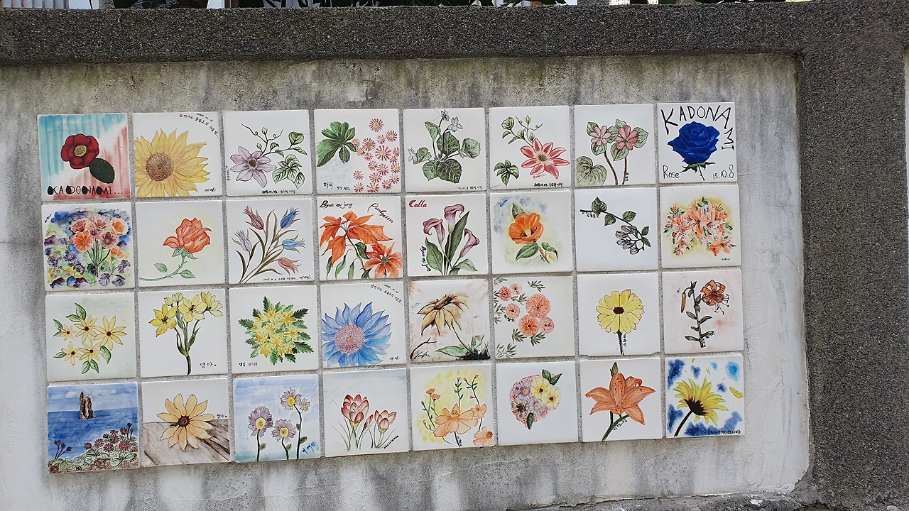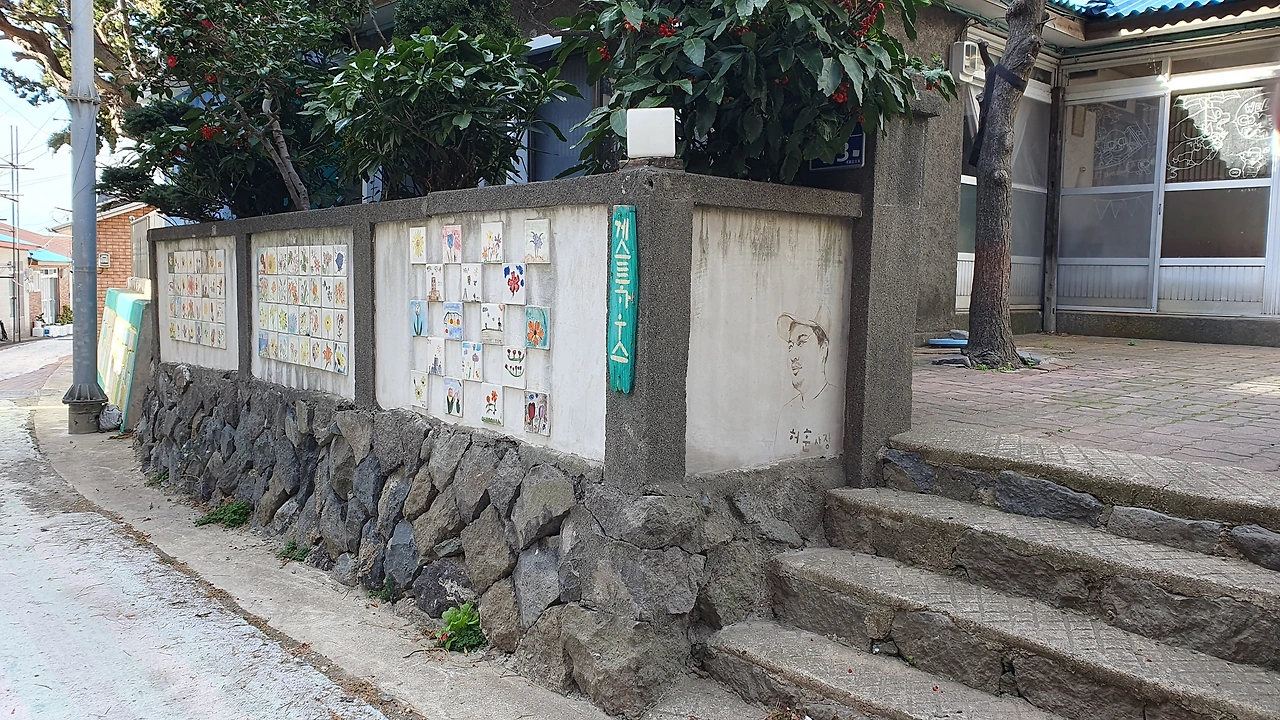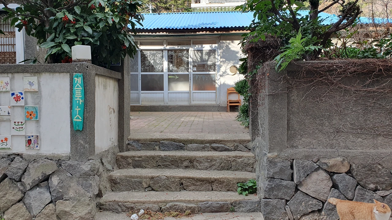 나에게 관심을 보이는 고양이를 무시하고 섬게스트하우스를 살펴보았다. 입구는 다섯개정도의 계단으로 마당에 올라갈 수 있고, 입구 왼쪽 담벼락에는 타일에 그림을 그리고 구워서 벽면을 장식해두었고 오른쪽 담벼락엔 담쟁이가 장식을 학 있는데 잎은 남아있지 않고 짙은 고동색 마른 줄기만 담벼락을 이리 저리 움켜잡고 겨울을 날 준비를 하고 있다.