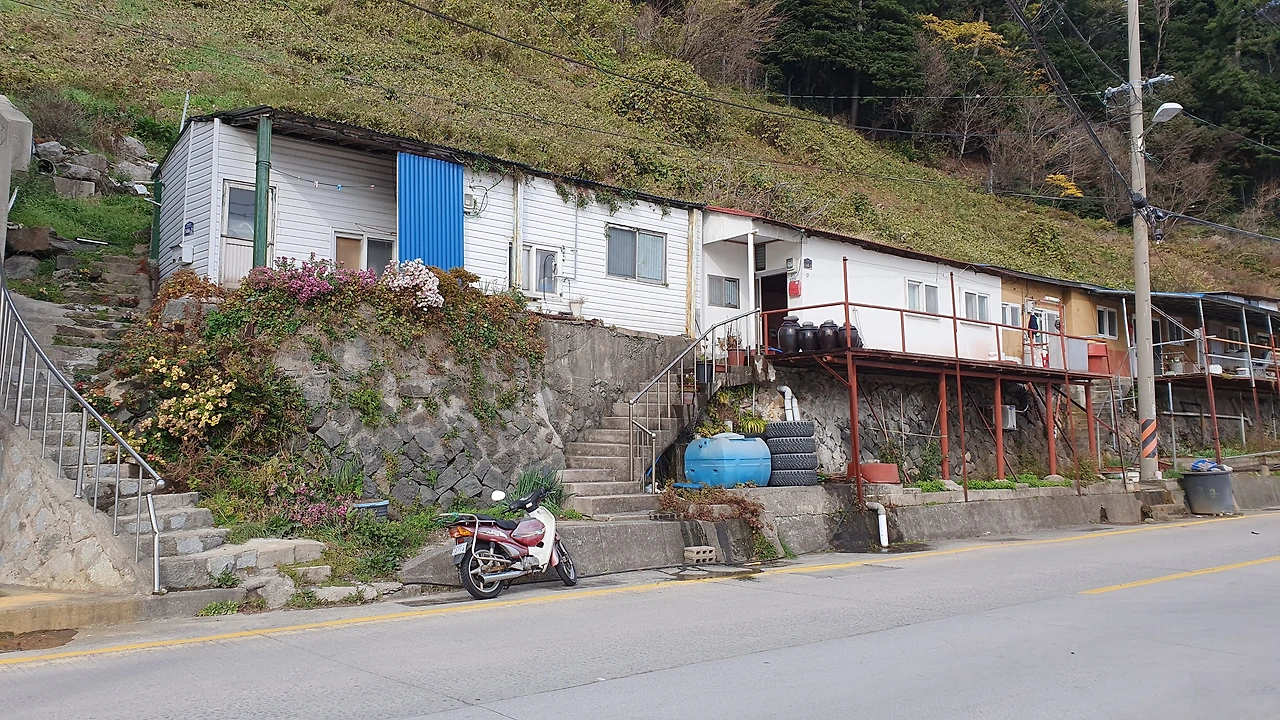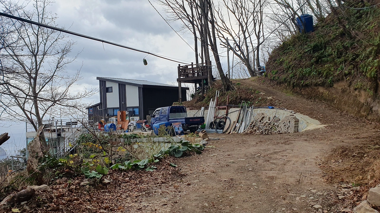 그곳에서 가까운 곳에 신기하게도 인가가 있다. 절벽같은 그곳에 바다를 보고 집을 지어놓았다. 집은 이층 집인데 한 층은 주인집으로 한 층은 팬션을 운영하고 있었다. 집 입구에는 털이 무성한 진돗개가 늠름하게 컹컹짖으며 반긴다.