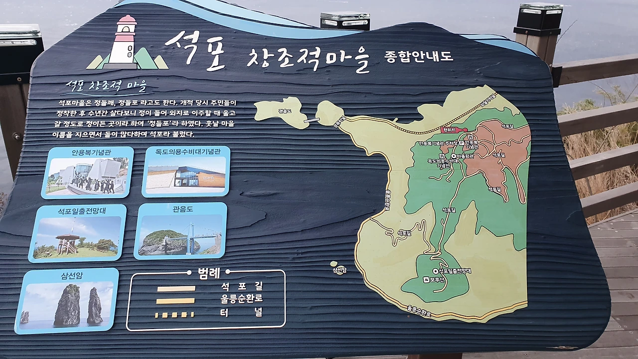 버스가 십여분간 산을 고불고불 올라가서 석포에 내리니 바다가 내려다보인다. 그 바다 중간에는 죽도가 동그랗게 바다 중앙에 있다. 이쁘다.