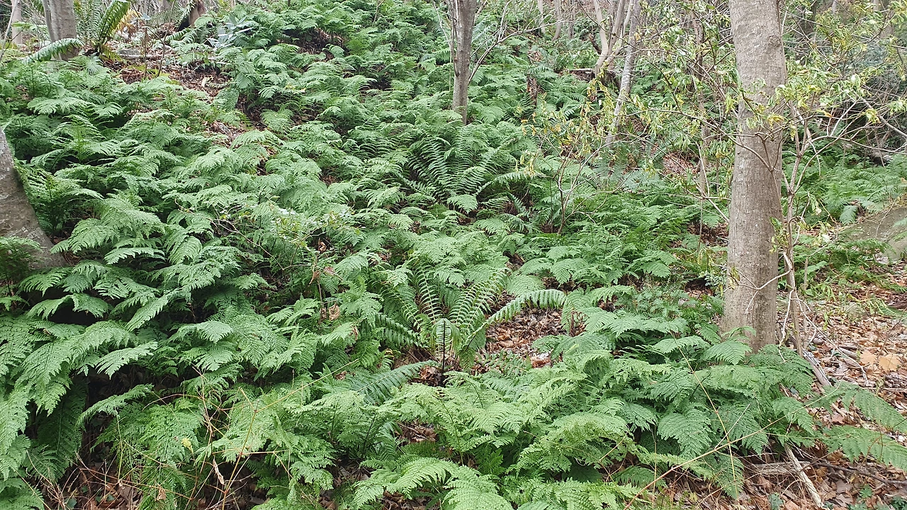 가는 길에 종종 동백꽃이 시들지 않고 송이째 떨어져서 길을 수놓고 있고, 언덕에는 새찬 바람에 건강하고 푸른 커다란 고사리들이 떼로 몸을 바람에 이리 저리 춤을 춘다.