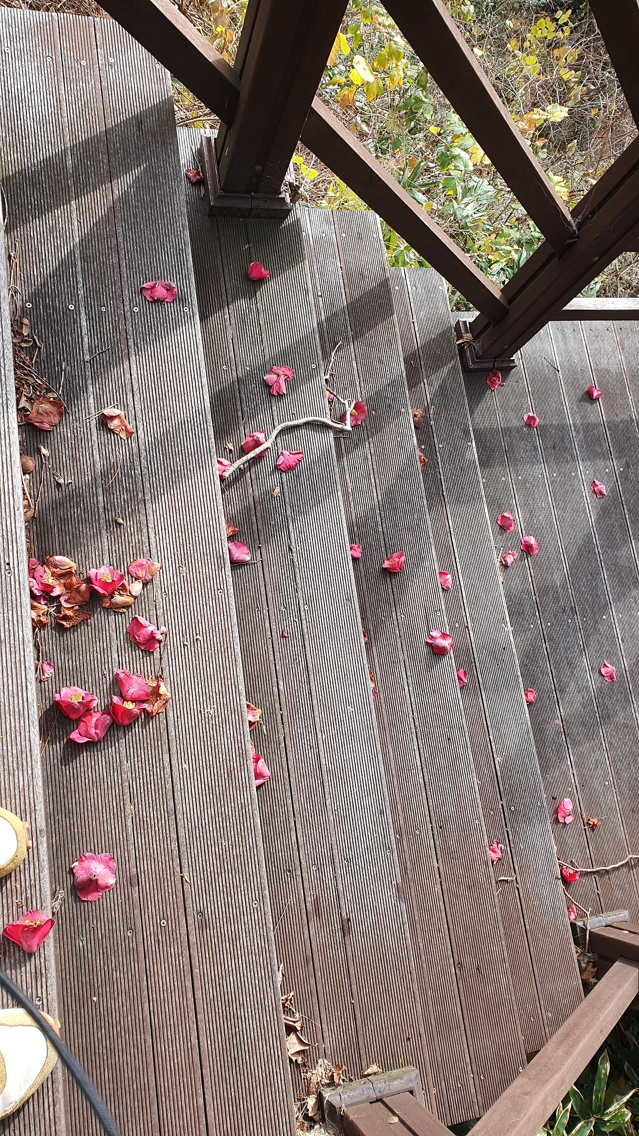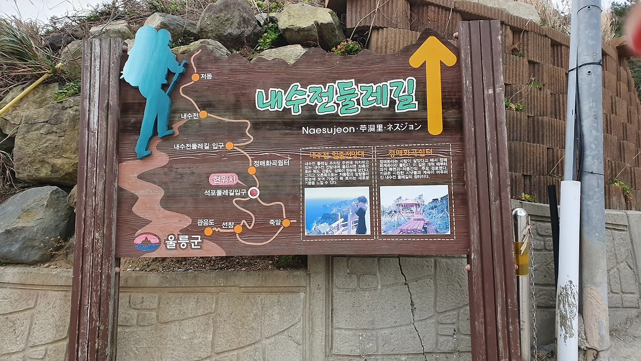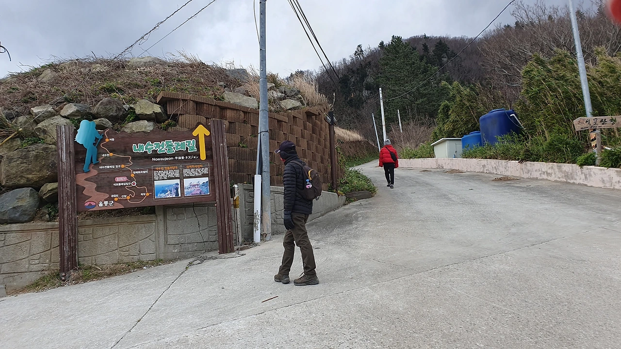 간식을 먹고 다리를 지나 내수전 전망대 입구로 나왔다. 산길이 끝나니 그곳은 시멘트 포장길이 몇백미터 이어져있다. 그리고 시멘트 포장길을 지나 다시 산길 계단으로 내려오니 계단에 동백꽃이 송이째 떨어져서 꽃계단이 되어있다. 그렇게 우리는 저동으로 걸어왔다.