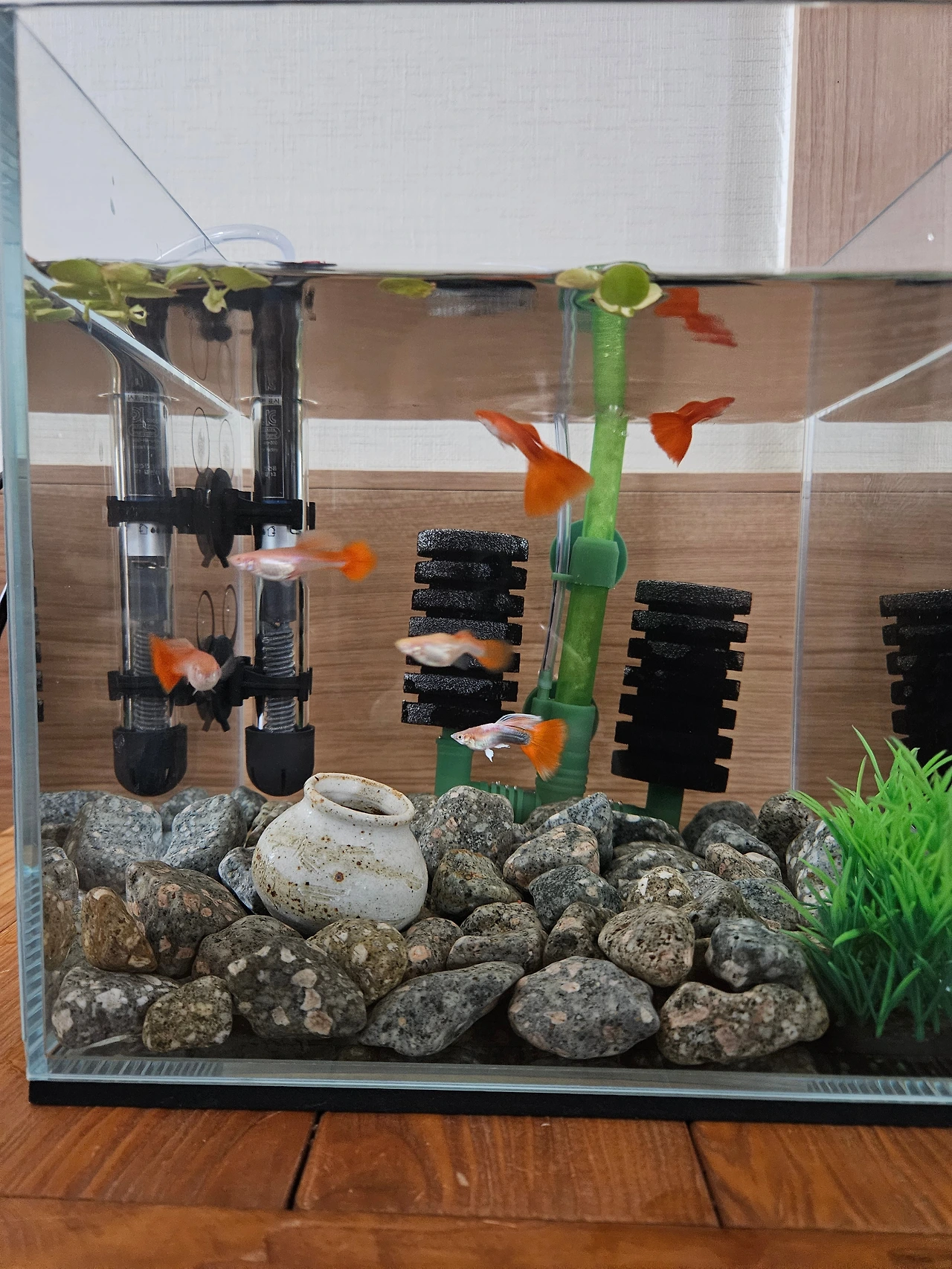 아무튼 이러한 생명 있는 것들을 관리하기 위해 아침 세수를 할 때면 물로 내 얼굴을 씻고 고사리에게 한 모금을 물을 준다. 그리고 거실에 나와서는 수족관의 물순환기가 제대로 돌아가는지 살펴보고 구피들에게 스푼으로 사료를 떠서 조금 넣어주고 화분을 슬쩍 돌아본다.