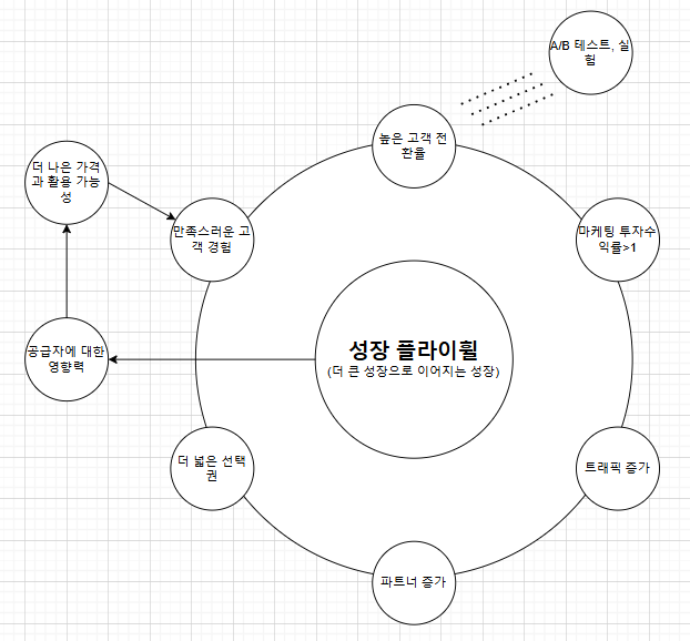 각각의 구성 요소가 가속기의 역할을 하며 네트워크 효과를 발휘하는 선순환 구조입니다. 많은 요소 중 어느 한 곳에만 투자해도 바퀴가 돌아가면서 나머지 모든 구성 요소에 혜택이 주어지고, 그것이 곧 성장으로 이어지죠. 그 출발점이 바로 만족스러운 고객 경험입니다. A/B 테스트를 통해 제품 경험을 개선하는 동시에 유저 전환을 가속화하는 거에요. 더 많은 유저에 의해 더 많은 전환이 일어날수록 바퀴는 더욱 빠르게 회전할 수 있고, 마케팅 부분의 투자수익률과 트래픽도 점점 더 늘어날 수 있습니다. 그러면 우리 플랫폼에 가입하기를 원하는 파트너의 수도 늘어나 우리에게 더 유리한 환경이 만들어지죠.