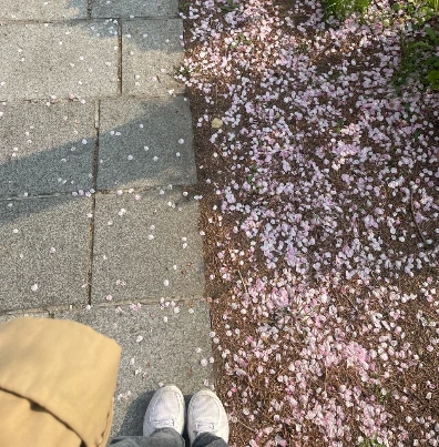 바닥에 떨어진 벚꽃이랑 바람 부는 대로 내리는 꽃비 기분이 좋아 느긋하게 걷는데 옷 위에 벚꽃 잎 하나가 사뿐히 앉았다. 선택받은 기분..!! 다 잘 된다는 걸까 마음이 몽글몽글 핑크빛으로 물든 산책로가 너무 예뻐서 기분이 좋았다.