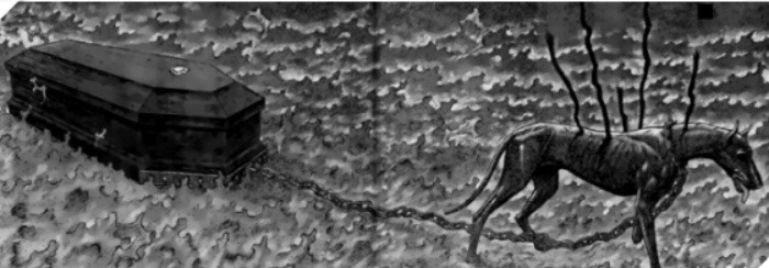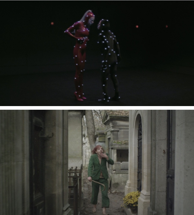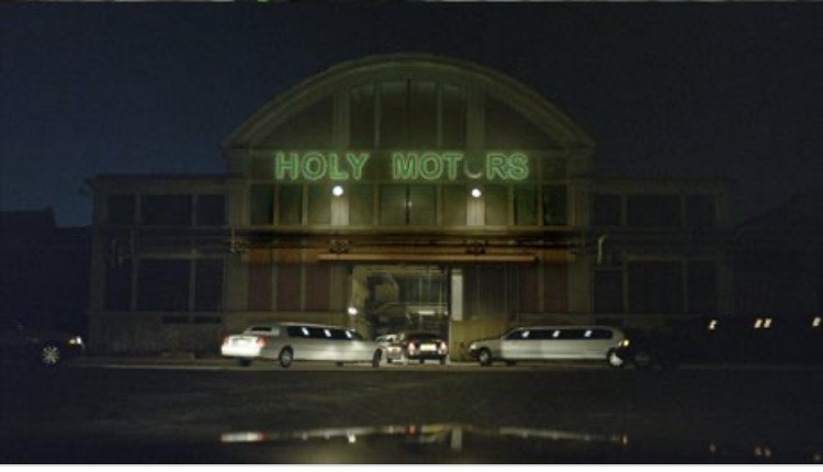 레오 까락스 감독 영화 중에 가장 눈에 띄는 영화는 '홀리 모터스'가 될 것이다. 이는 유독 이 영화가 훌륭하다고 말하는 것이 아니다. 레오 까락스 감독 영화에 나락의 이미지는 있어도 죽음의 이미지는 강하지 않았다. 오히려 열정적인, 죽음도 두려워하지 않는 사랑의 이미지가 강했다. 하지만 감독의 10년 정도의 공백 후 나온 '홀리 모터스'엔 죽음의 이미지가 장난스럽고도 징그럽게 깔려있다. 영화 초반부터 죽음에 대한 이미지는 강하게 깔려있다. 영화의 도입부에 감독 본인이 직접 출현한다. 감독은 죽어있는지 자고 있는지 어떠한 움직임도 보이지 않는 관객들을 둘러본다. 이렇게 무미건조하게 영화를 보는 관객의 모습은 영화감독에겐 지옥일 것이다. 이 씬에서 유일하게 움직이는 존재는 장난스럽게 뛰어가는 아기와 늙고 지쳤지만 포악스러운 검은 개뿐이다. 안타깝게도 카메라는 검은 개한테 포커스가 맞춰진다. 이 검은 개의 질척한 걸음걸이는 케르베로스를 연상시킨다.