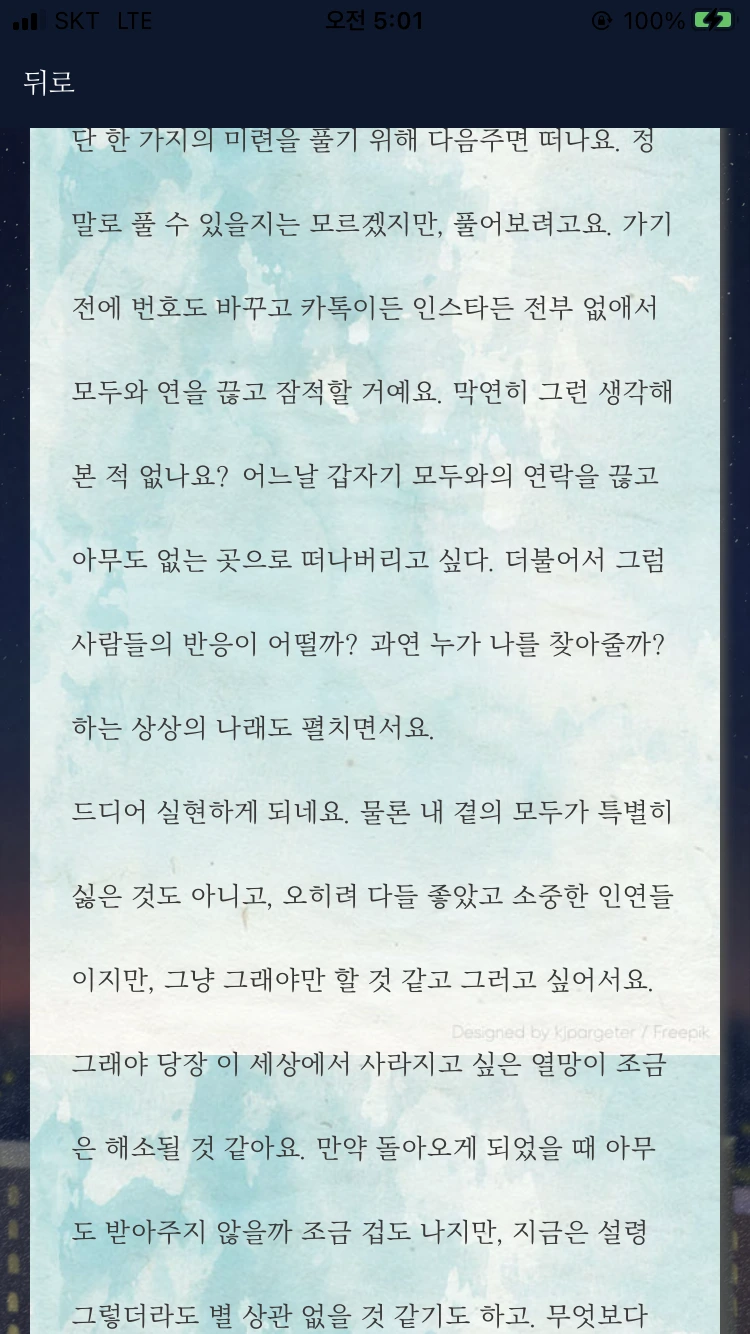 사실 느닷없는 타임워프를 해서 이 글을 쓴 목적은 밤 편지에 대한 이야길 하기 위해서다. 그전에 짚고 넘어가자면 내가 이 어플을 홍보하려는 건 절대로 아니다. 렉이 아주 잦고 심해서 고혈압에 걸려 쓰러질 뻔한 적이 한두 번이 아니었다. 개트롤편지로 이름 바꿔도 될 듯. 음 말이 너무 심했나... 그래도 참 감성적이며 기특한 어플이다ㅎㅎ(수습)