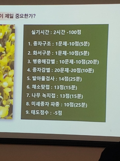 시험은 종자 감별과 병충해, 방제법, 접붙이기, 발아율 계산, 종자 파종 등 필기와 실기가 있었고 기능사인 만큼 전체적인 난도는 높지 않았지만 공부를 안 하고는 절대 자격증을 딸 수 없었다.