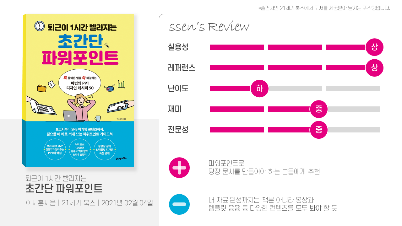 리뷰 제안도 제안이지만 호기심도 발동했습니다. 어떤 내용을 다뤘으며, 어떻게 디자인했는지, 어떤 팁들이 있는지 말이죠.(파워포인트를 다루는 분들이 모두 똑같은 팁을 다루는 건 아닙니다.)