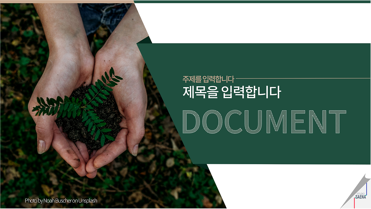 템플릿에서 어떤 컬러를 사용할지 정한 후에는 추가할 오브젝트를 찾아봅니다. 저는 보통 표지 작업부터 먼저 하는데요. 환경 컨셉을 살릴 사진이나 도형 등을 찾아봅니다. 흔히 환경과 연관된 이미지들이 비슷비슷하다 보니 새로운 것만 찾는 경우들이 있는데 반복된 오브젝트가 나쁜 건 아니라고 생각합니다. 공통적으로 생각하는 컨셉이라는 의미도 되니까요. 대신 조금 더 묵직한 느낌의 이미지를 unsplash에서 사용했습니다. 서로 어울리는 컬러와 사진을 연결한 표지, 메인 페이지는 다음과 같습니다.