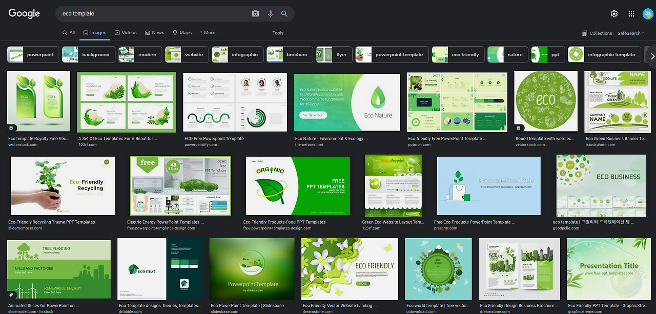 일단은 관련된 주제로 어떤 템플릿들이 있는지 살펴봅시다. 지금 '환경 컨셉의 템플릿'이라고 하면 얼핏 떠오르는 녹색의 이미지들을 구글 창에서도 쉽게 볼 수 있습니다.