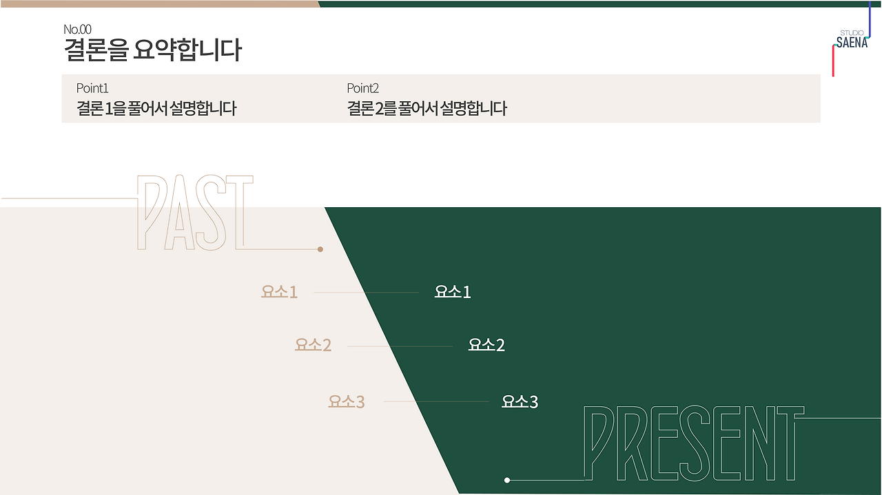 이 방법은 전체 문서에서 가끔 포인트를 줄 때 좋은 방법인데요. 제가 썼던 디자인에서는 시간의 변화를 의미하는 PAST와 PRESENT에 대해 표현할 때 사용했습니다.